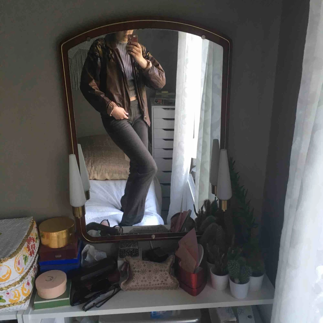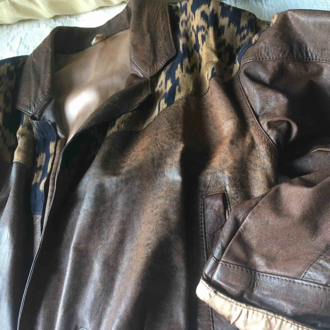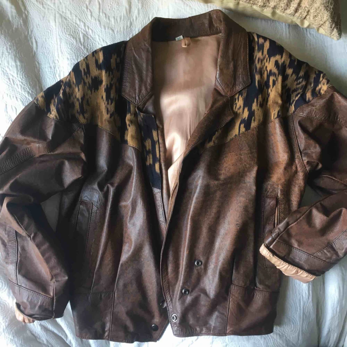 En äkta 80-tals skinnpaj( imitations läder) med coola tygdetaljer och knäppning där nere