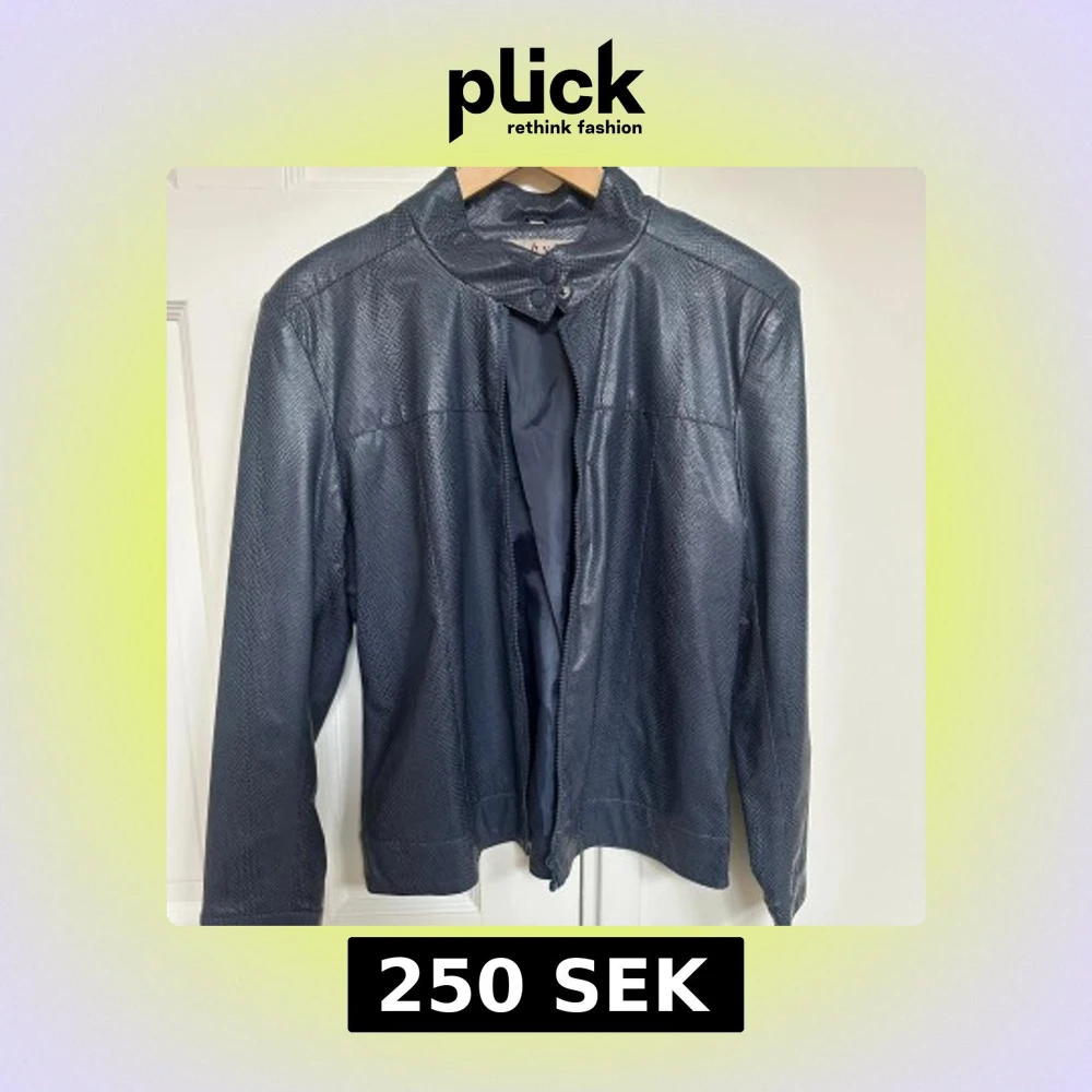 Snygg blå skinnjacka med texturerad yta och dragkedja framtill. Jackan har en stilren design med långa ärmar och en hög krage med knappdetalj.