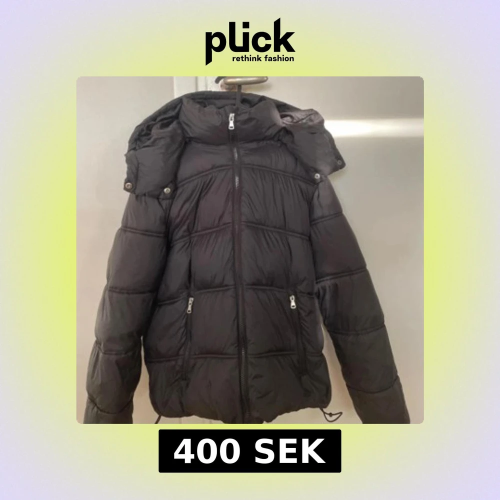 Säljer en svart pufferjacka med dragkedja framtill och två fickor med dragkedja. Jackan har en avtagbar huva och justerbar nederkant med snörning. Perfekt för kyligare dagar och enkel att matcha med olika outfits.