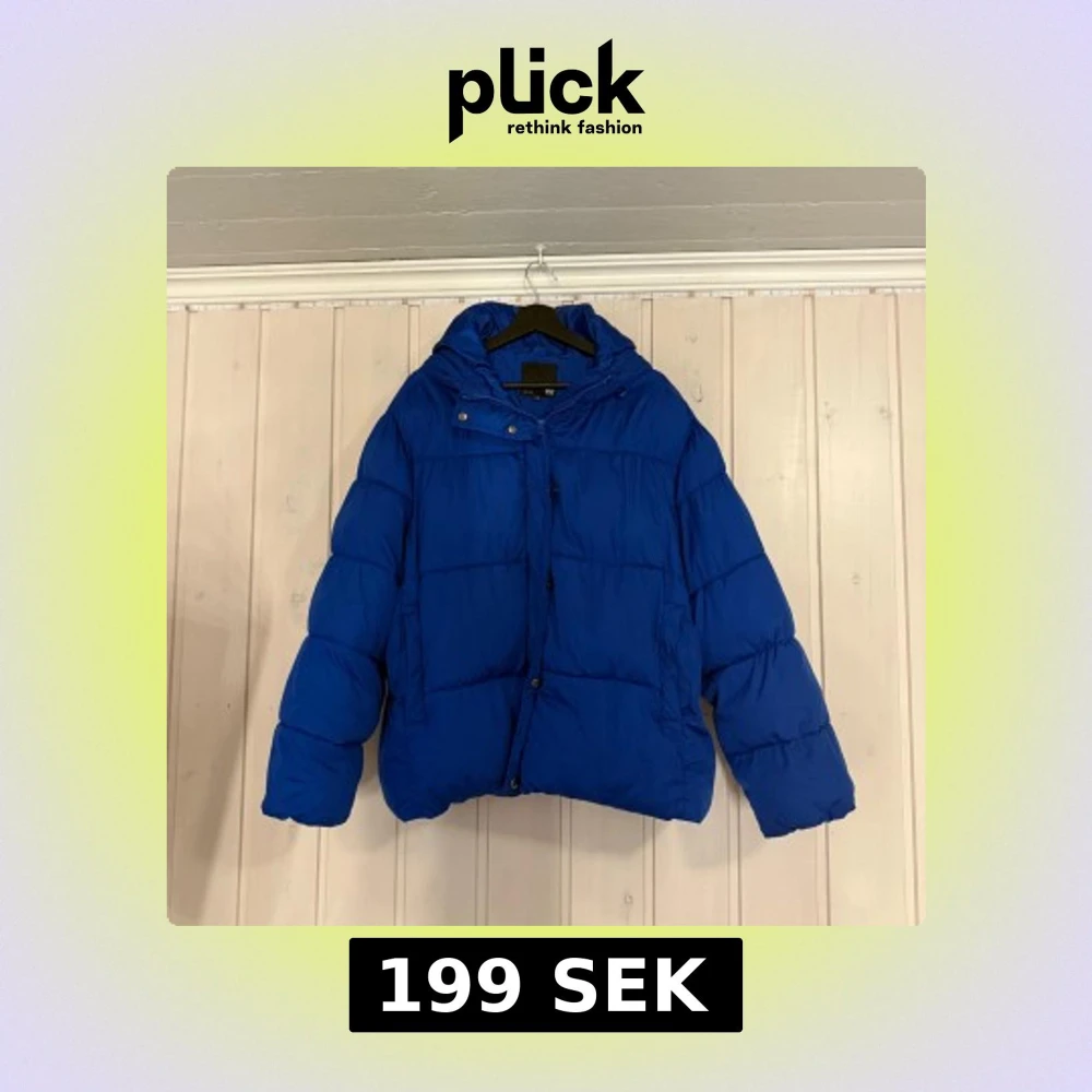 Blå pufferjacka med huva och dragkedja samt knappar framtill. Jackan har en boxig passform och är vadderad för extra värme. Perfekt för kalla dagar och har en stilren look som passar till det mesta.