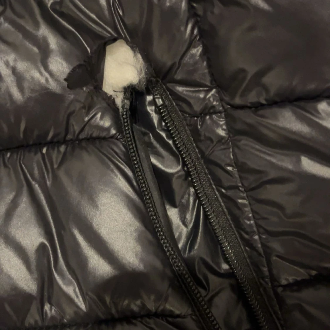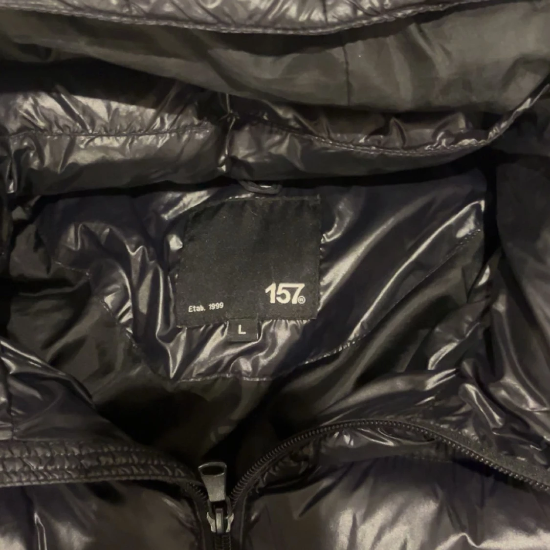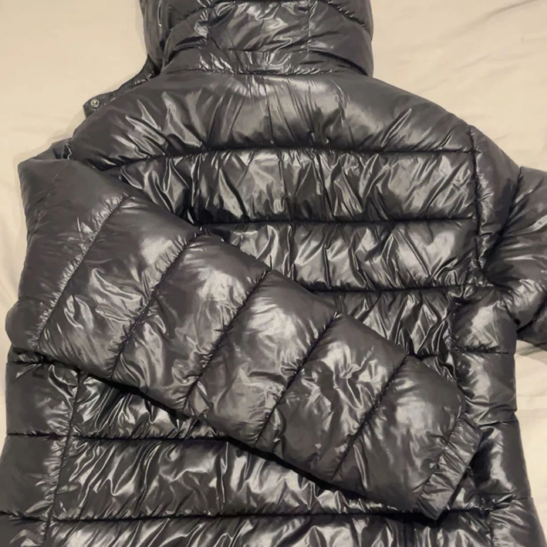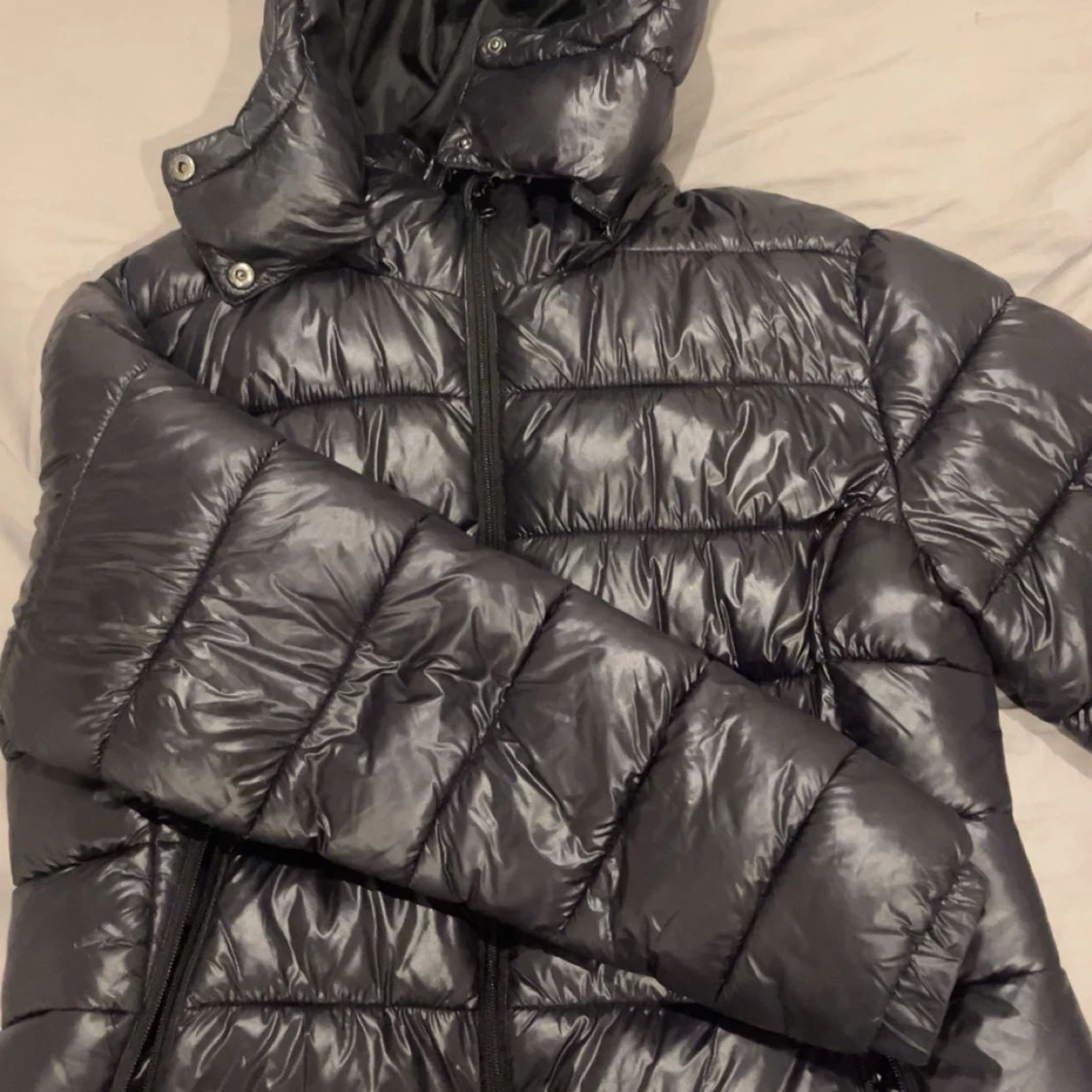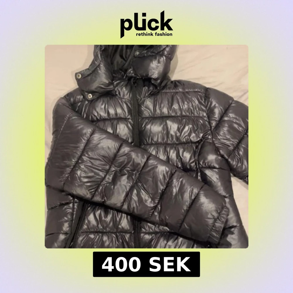 Säljer en svart pufferjacka med huva och dragkedja framtill. Jackan har en glansig finish och är vadderad i breda kanaler för extra värme. Perfekt för kalla dagar och har en modern, sportig look. Har ett hål i fickan som går att fixa med nål och tråd, fickan går att stänga ändå. När fickan är stängd och jackan är på så syns inte hålet!
