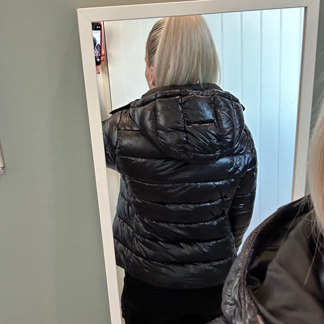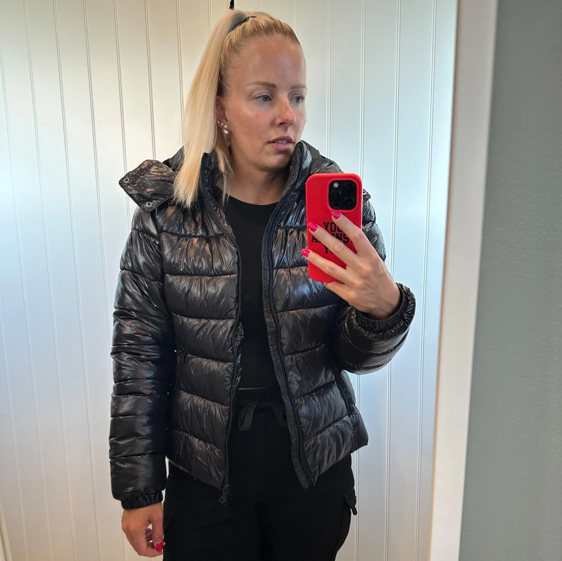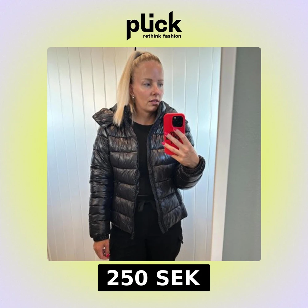 Säljer en svart pufferjacka med glansig finish och huva. Jackan har dragkedja framtill och är quiltad med breda kanaler. Perfekt för kalla dagar och har en modern, lite boxig passform. Snygg att styla med både jeans och cargo.