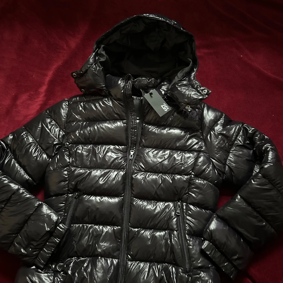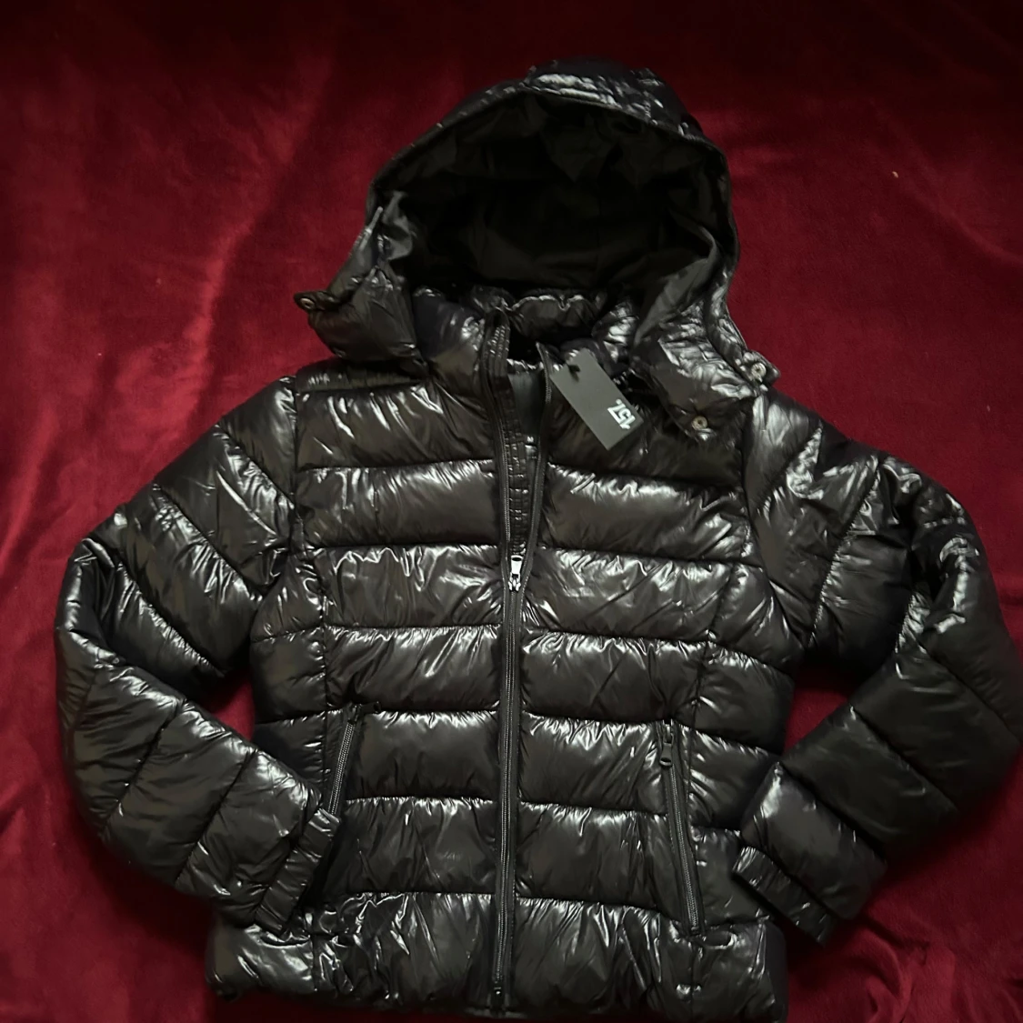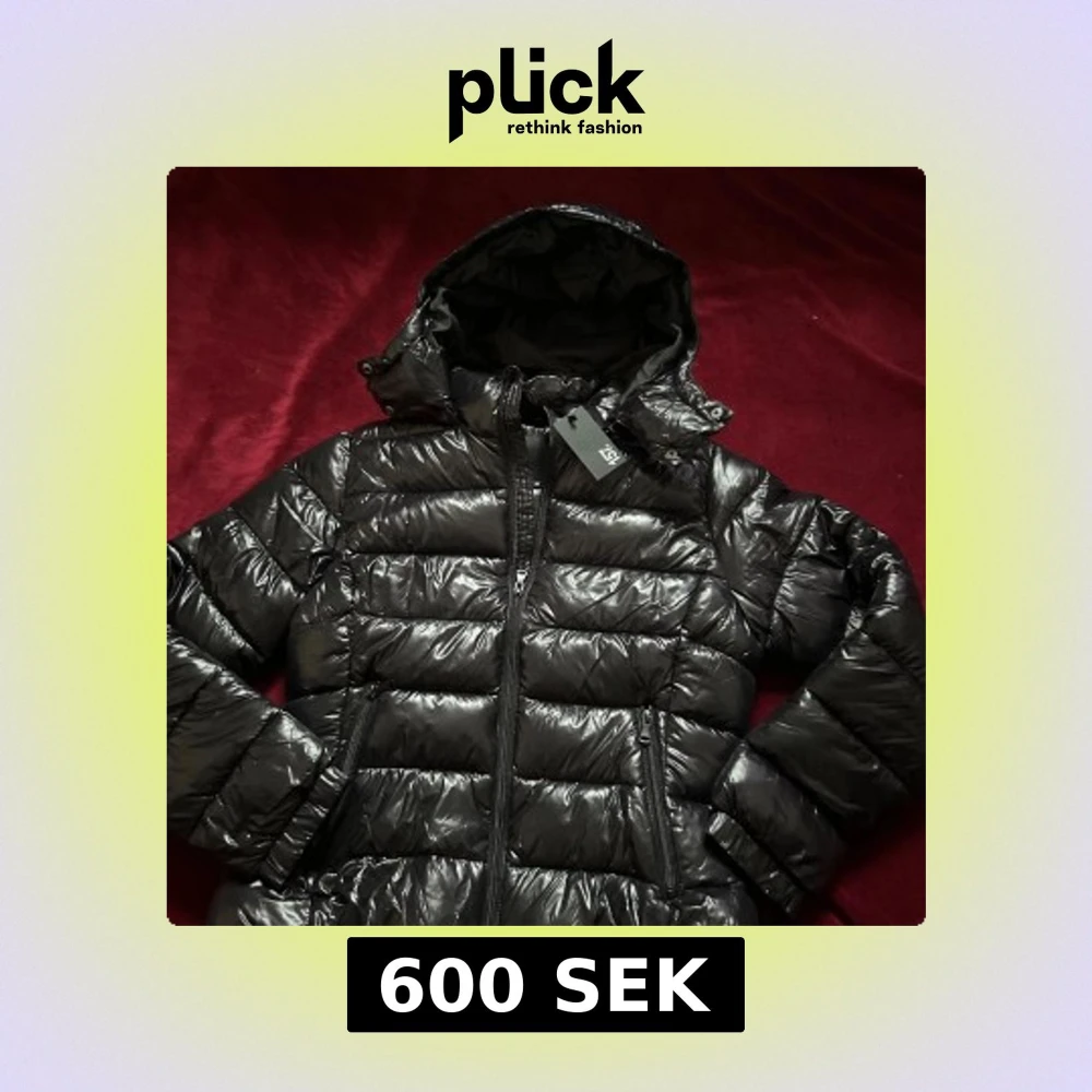 Snygg svart dunjacka med huva och dragkedja framtill. Jackan har en glansig yta och är perfekt för kyligare väder. Den har långa ärmar och två fickor med dragkedja.
