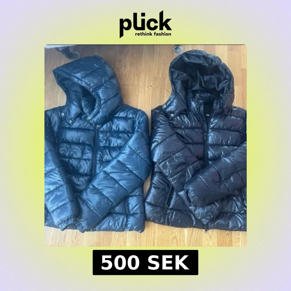 Två pufferjackor med huva i svart och mörkblått. Dom är helt nya, aldrig använts. Båda har quiltad design, dragkedja framtill och långa ärmar. Perfekta för kyliga dagar och även nu perfekt inför hösten. Det ger en sportig vibe. Snygga att bära till jeans eller mjukisbyxor. Dom är köpta ifrån lager 157. Om du är intresserad om priserna så säljs båda tillsammans för 500kr, men varsin så säljs dom för 250. Priset kan diskuteras.