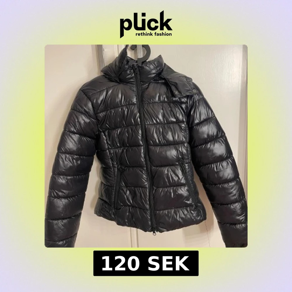 Säljer en svart pufferjacka med glansig finish och huva. Jackan har quiltad design, två sidofickor med dragkedja och hel dragkedja framtill. Perfekt för kalla dagar och har en modern, lite boxig passform som är både snygg och bekväm.