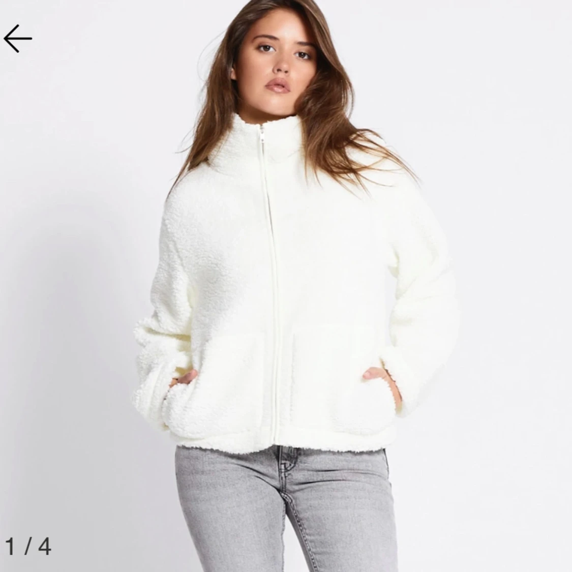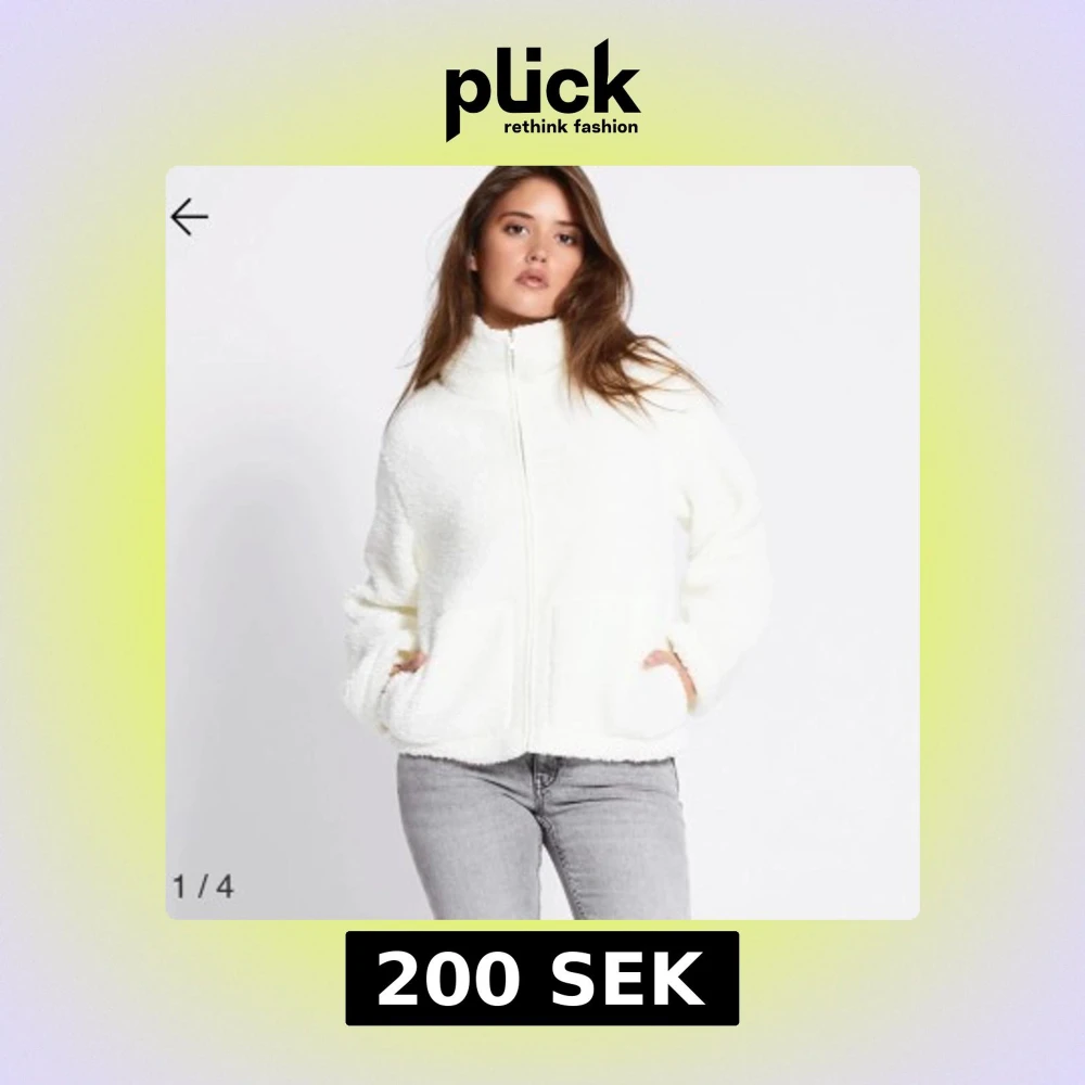 Mysig vit teddyjacka med hög krage och hel dragkedja framtill. Jackan har två stora fickor och en avslappnad passform. Perfekt för kalla dagar när du vill vara både varm och snygg.