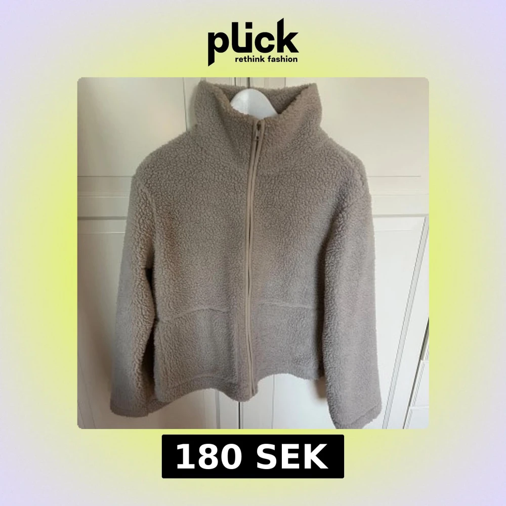 Mysig beige teddyjacka från 157 i storlek S. Jackan har hög krage, dragkedja framtill och är tillverkad i fluffigt teddy-material. Perfekt för kyliga dagar när du vill vara både varm och stilren.