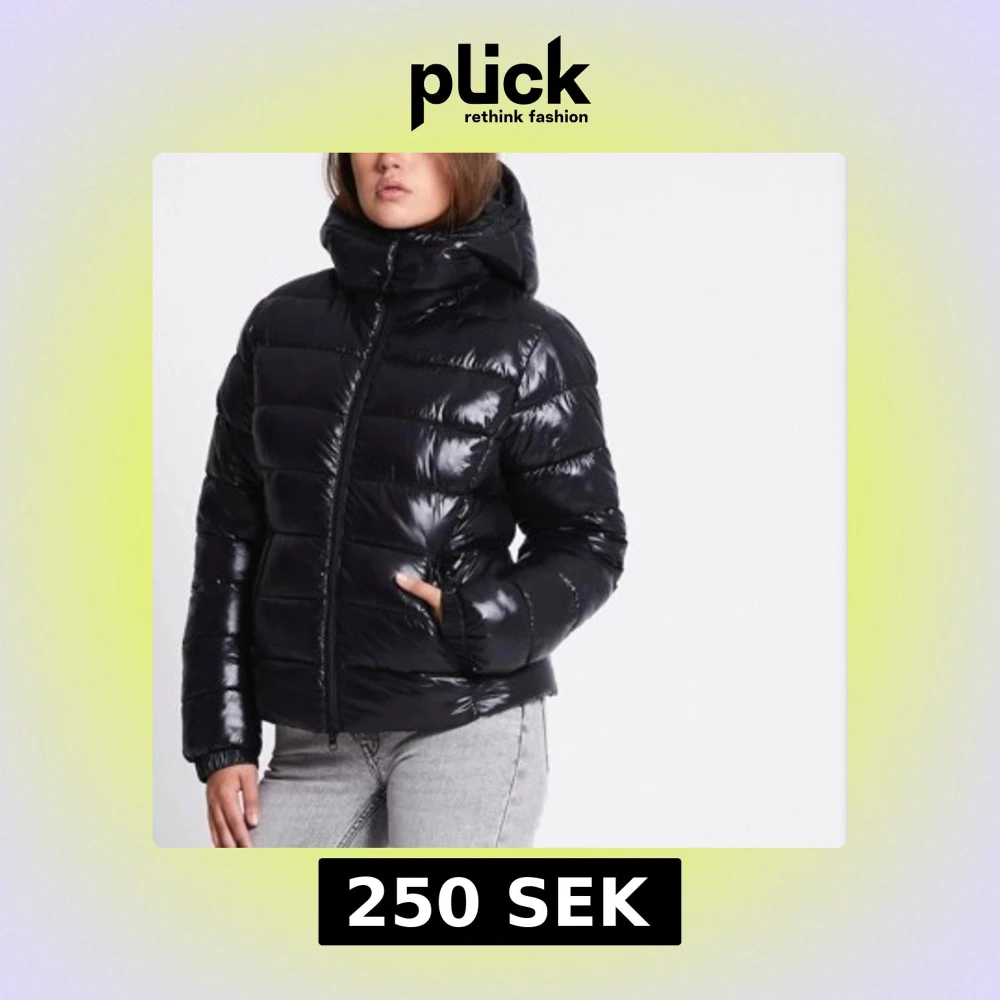 Snygg svart pufferjacka med glansig finish och stor huva. Perfekt för kalla dagar när du vill hålla stilen och värmen. Super populär från lager
