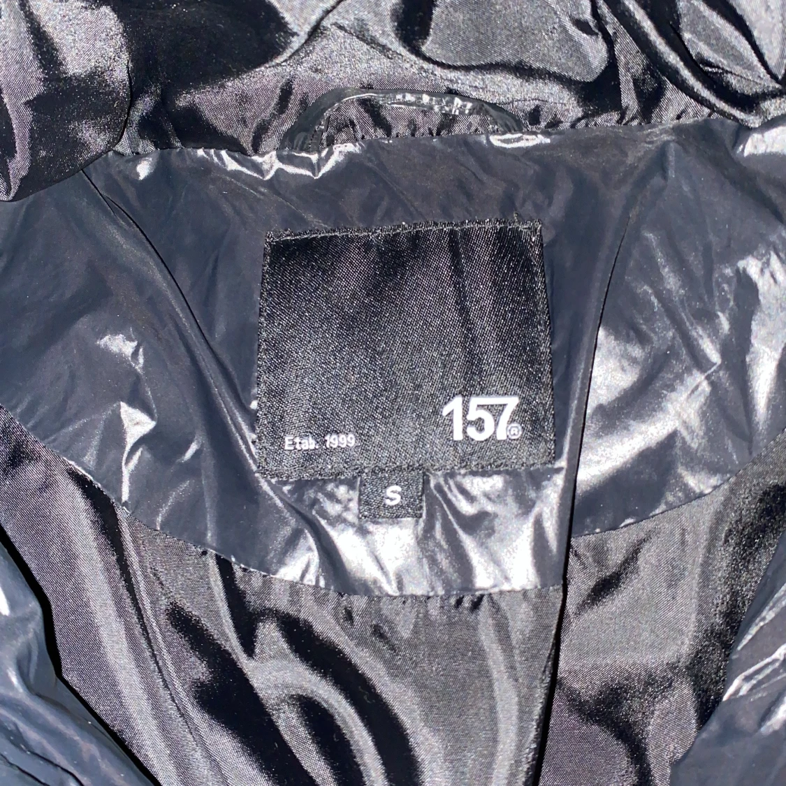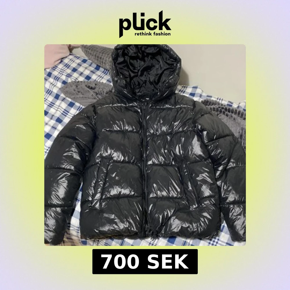 Säljer en svart, glansig pufferjacka från 157 med huva och dragkedja. Jackan är vadderad och har en oversized look, perfekt för kalla dagar. Enkel och stilren design som funkar till det mesta. Storlek S men passar som M