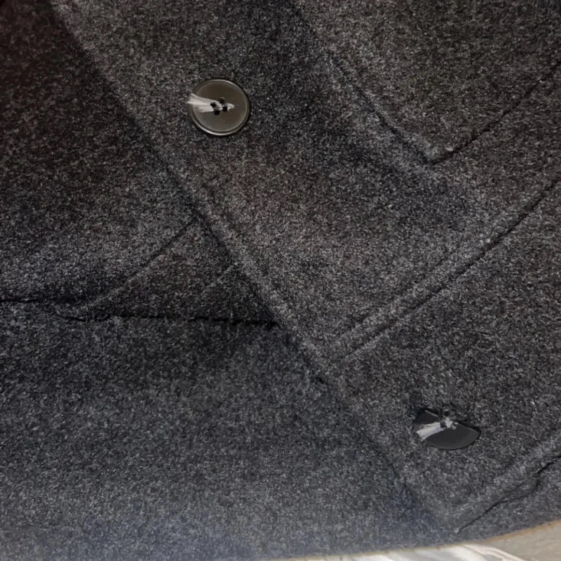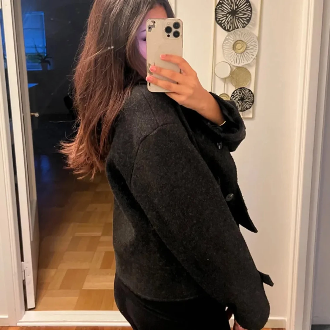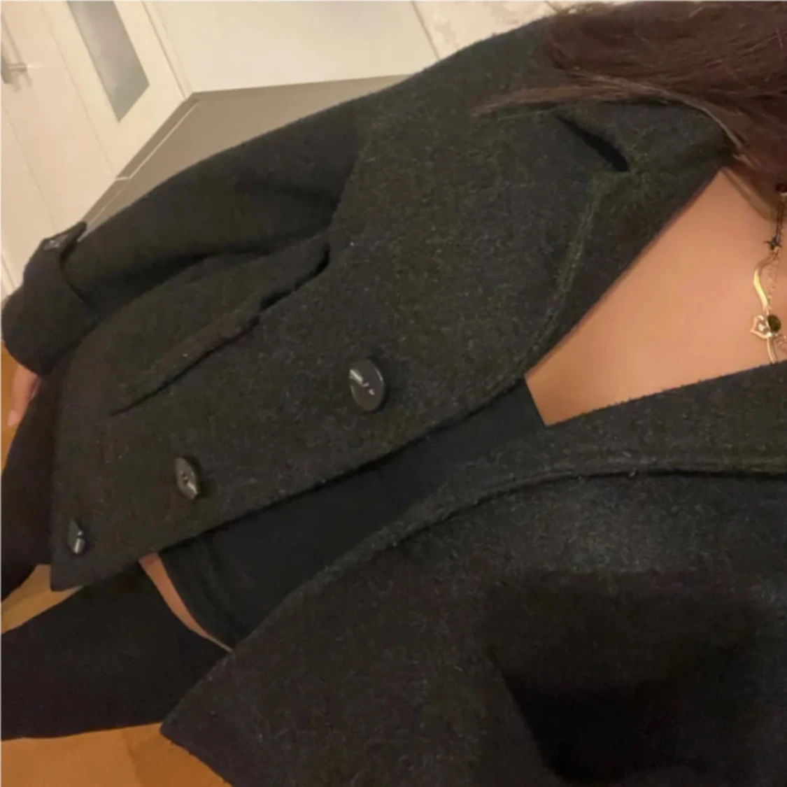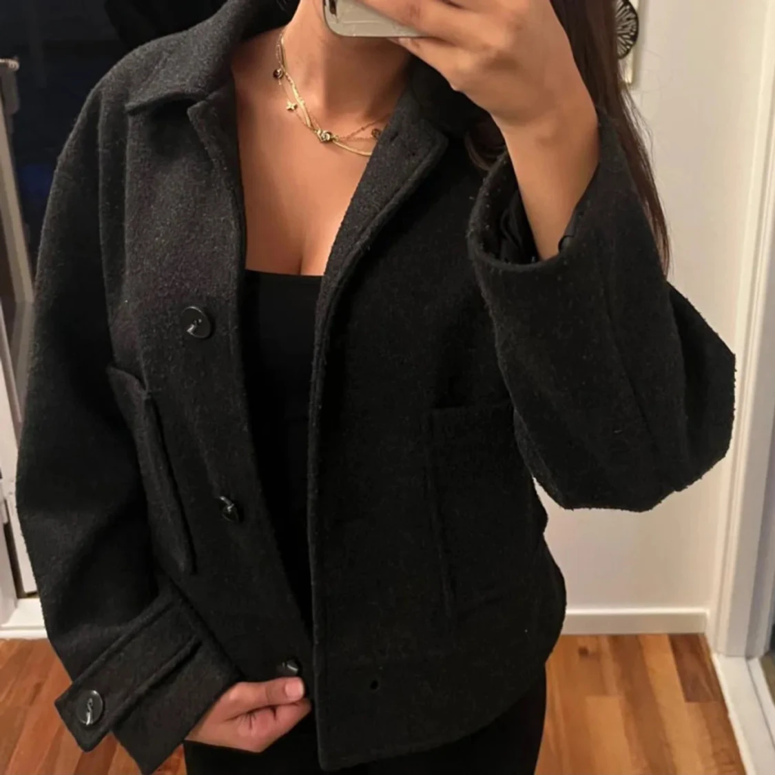 Säljer en svart, kortare ulljacka från 157 med klassisk krage och stora knappar framtill. Jackan har två fickor och en rak, boxig passform som ger en chill vibe. Perfekt för lager-på-lager och snygg till både jeans och kjol.