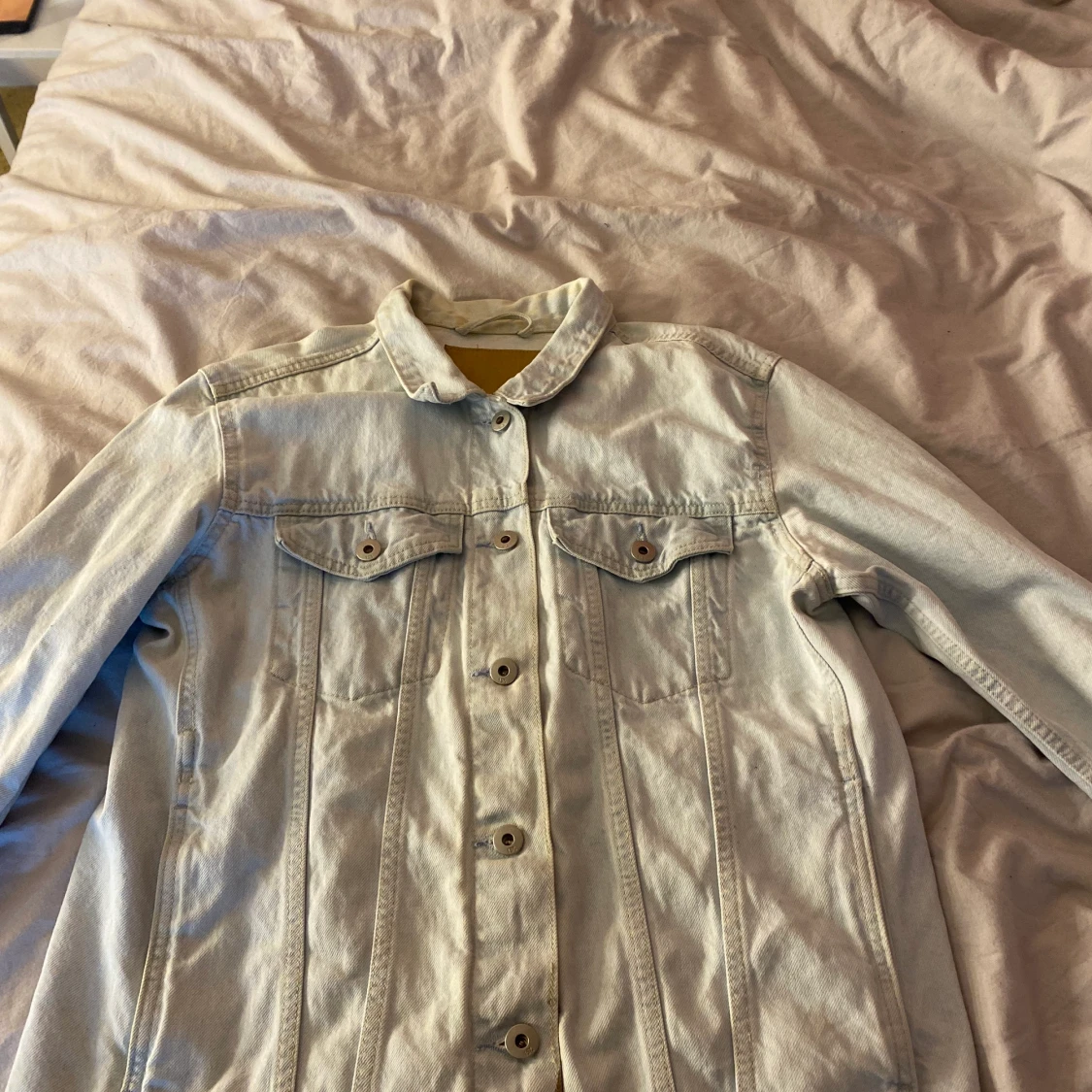 En väldigt fin jeansjacka från Lager 157. Jackan är väldigt stor i storleken. Färgen är en blandning emellan ljusblå och vit.