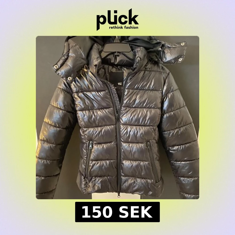 Snygg svart pufferjacka med avtagbar huva och dragkedja framtill. Jackan har en glansig yta och två praktiska fickor med dragkedja. Jackan är sparsamt använd och har inga tydliga täcken på användning finns dock någon fläck vid kragen av smink