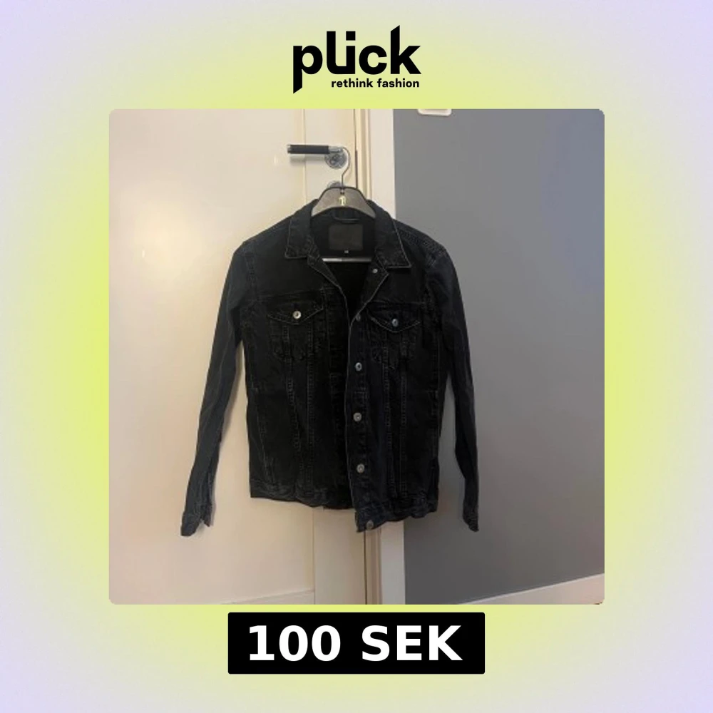 Snygg svart jeansjacka med klassisk krage och silvriga knappar framtill. Jackan har två bröstfickor med lock och knapp, samt raka sömmar.