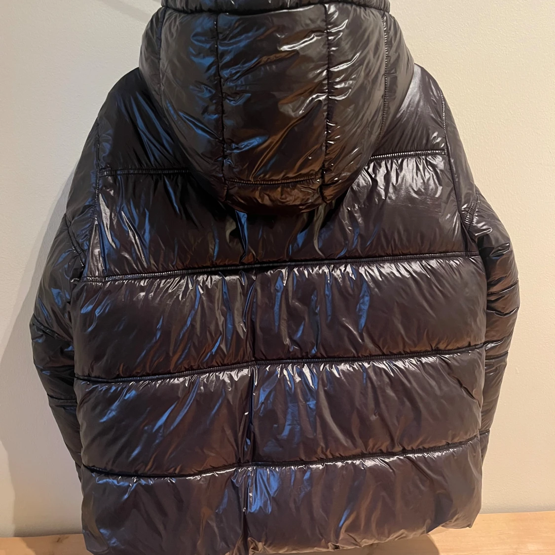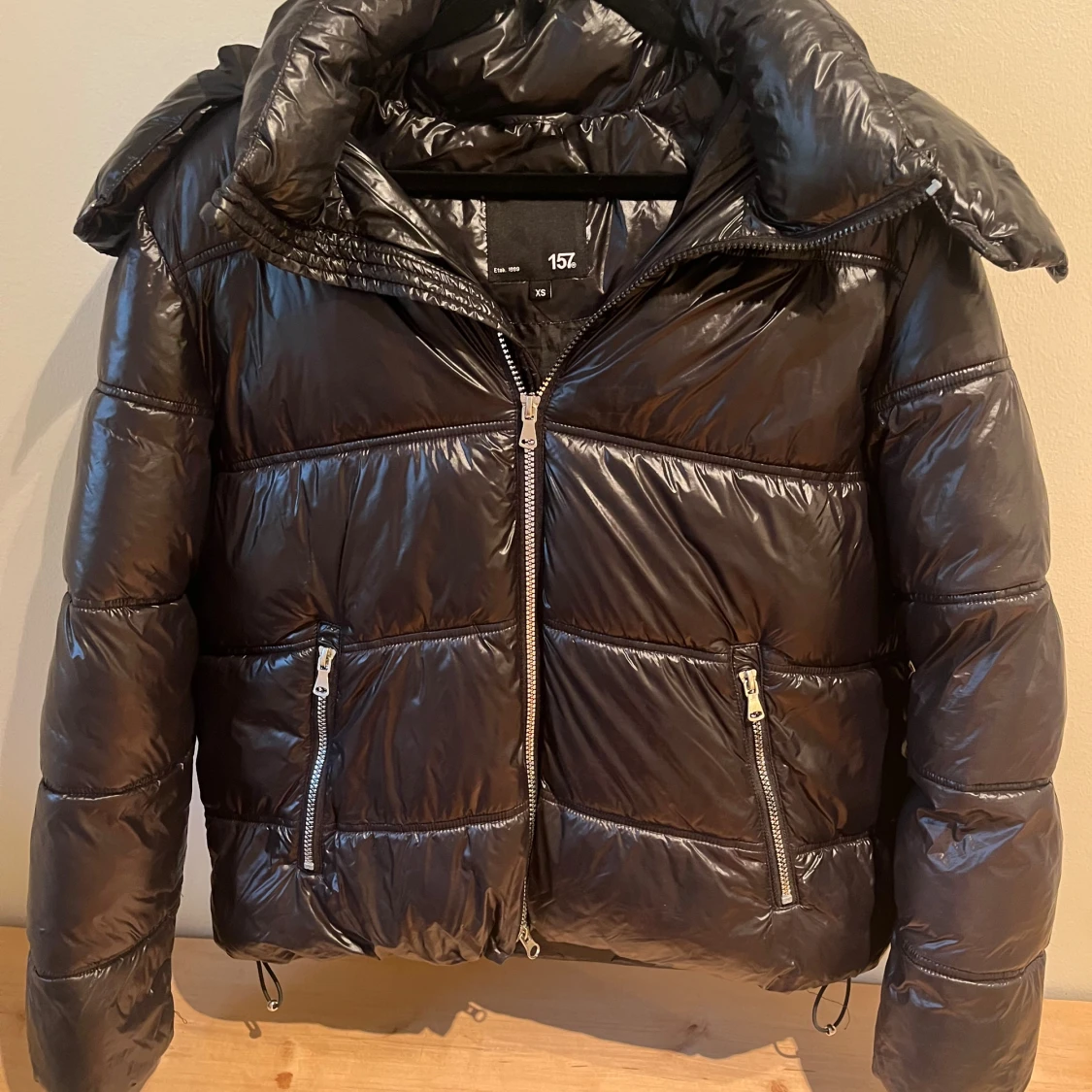Säljer en svart, glansig pufferjacka från lager 157 i storlek XS. Helt ny utan lappar