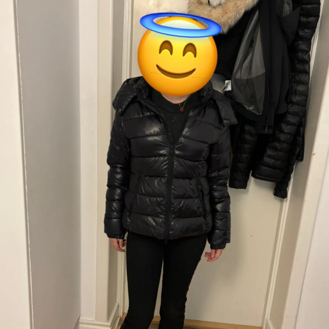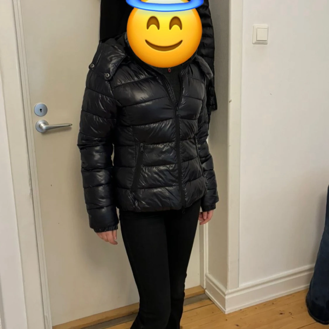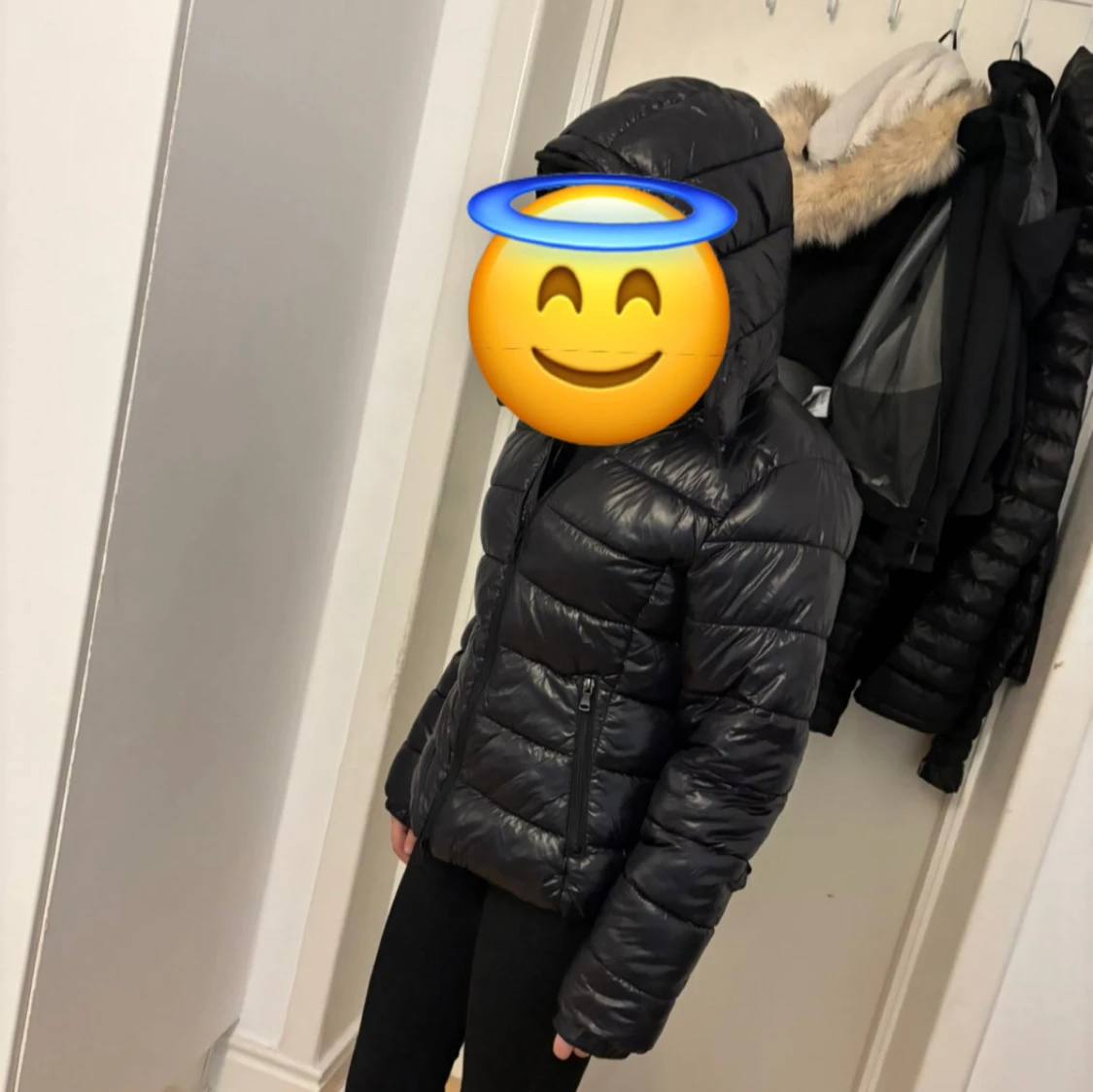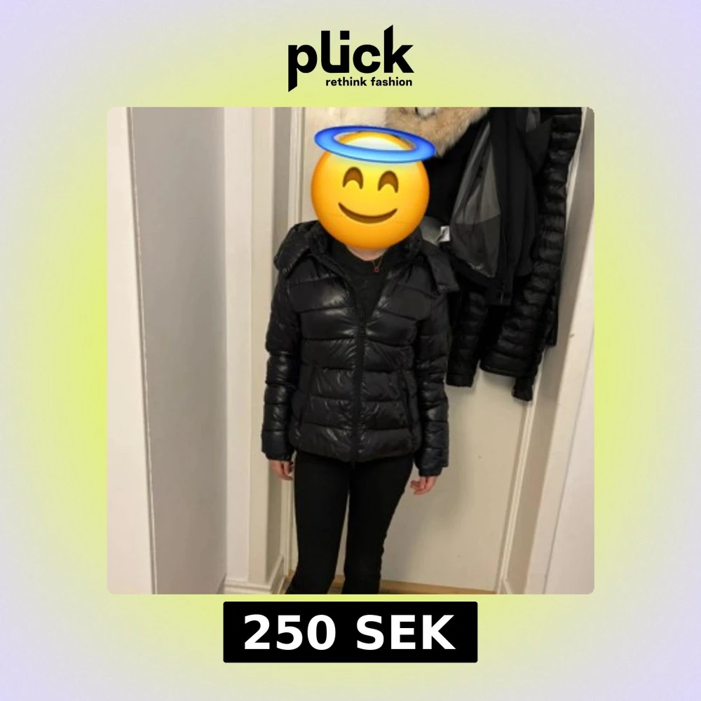 Säljer en svart pufferjacka med huva och dragkedja framtill. Jackan har quiltad design och två fickor med dragkedja. Perfekt för kyliga dagar och enkel att matcha med olika outfits.