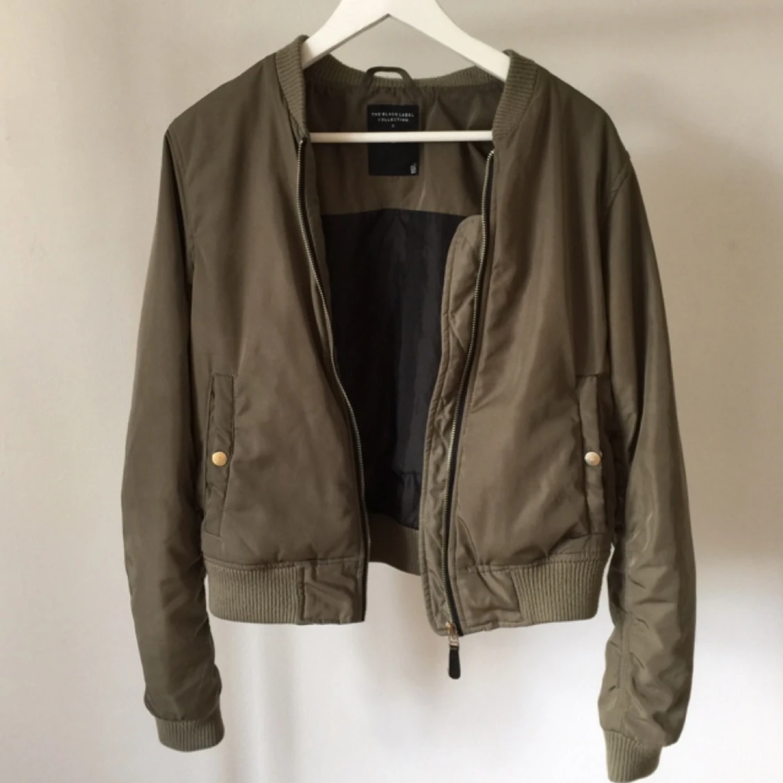 En bomberjacka från Lager 157 i en militärgrön färg som passar bra till hösten! Sömmarna börjar bli slita och jag har sytt igen där det hade gått sönder vid fickorna (se bild 3). Även en söm på insidan av jackan är sydd. Annars är det en väldigt fin jacka och hoppas du vill ta över denna!
