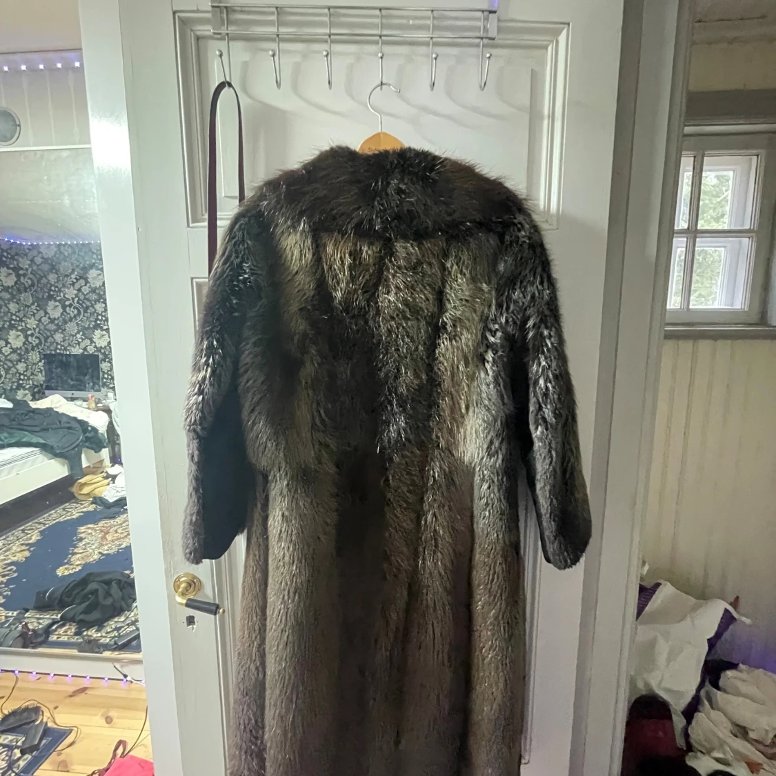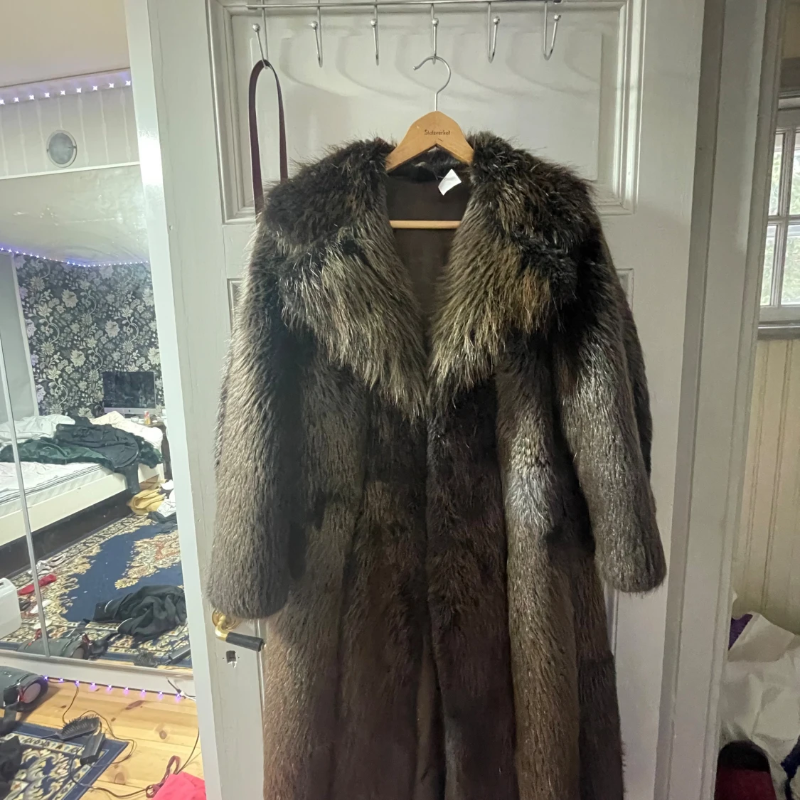 Säljer en lång och maffig pälsjacka i mörkbruna och grå toner. Jackan har bred krage, rak passform och långa ärmar. Pälsen är tät och ger en riktigt lyxig känsla, perfekt för kalla dagar när du vill sticka ut.