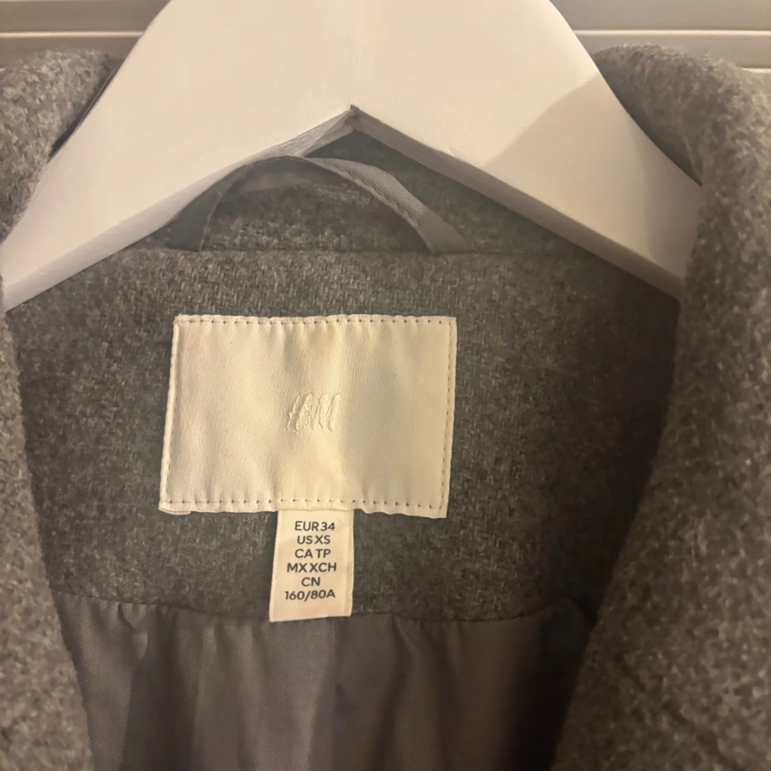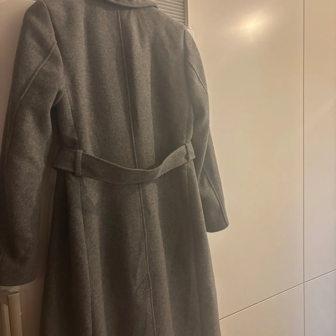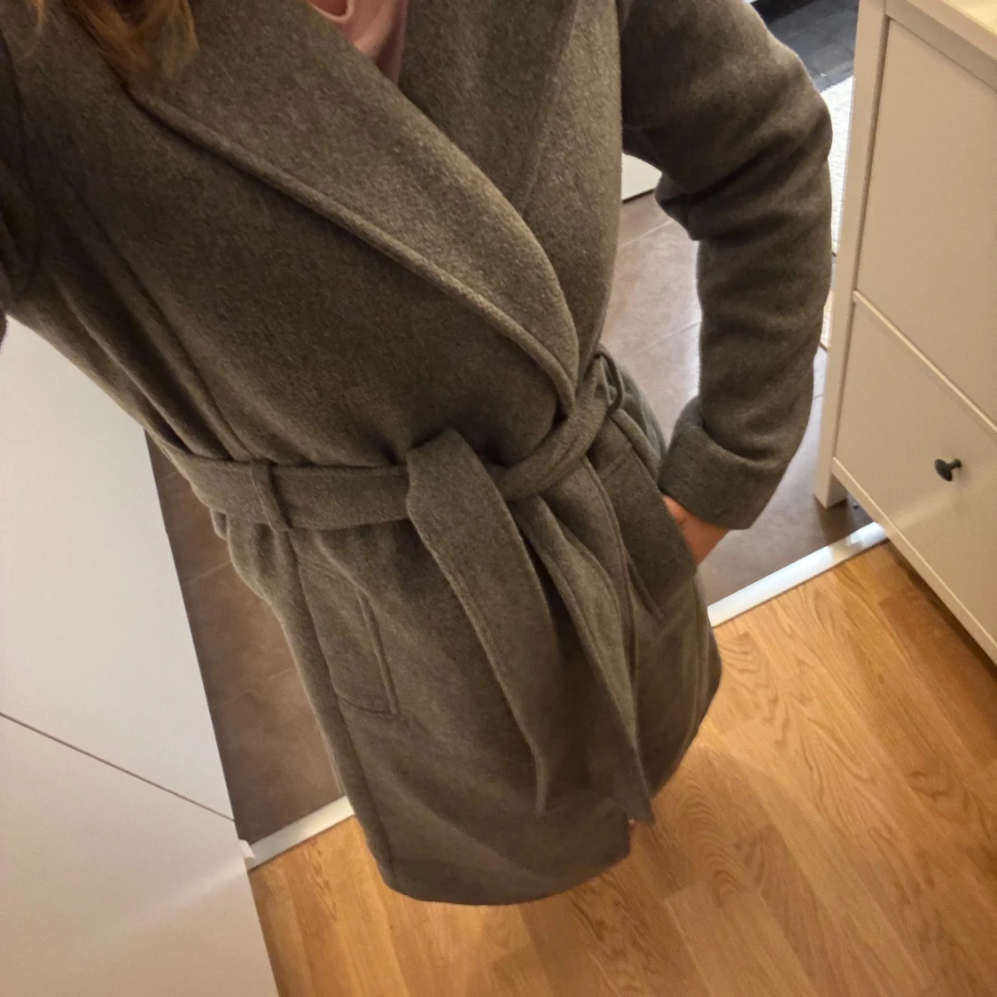 Snygg grå kappa med bred krage och knytskärp i midjan. Lång modell med raka ärmar och stora fickor framtill. Perfekt för dig som vill ha en stilren och klassisk look under kyliga dagar. Materialet känns mjukt och värmande. Sällan använd som ny!