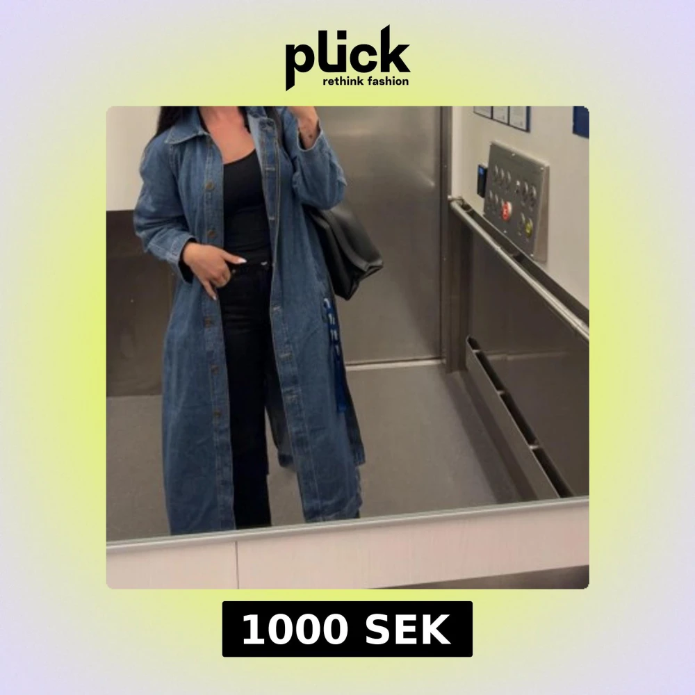 Säljer en lång blå jeansjacka med knappar framtill. Jackan har klassisk krage och långa ärmar. Perfekt att slänga över en outfit för en cool look. Passar dig som gillar oversized stil.