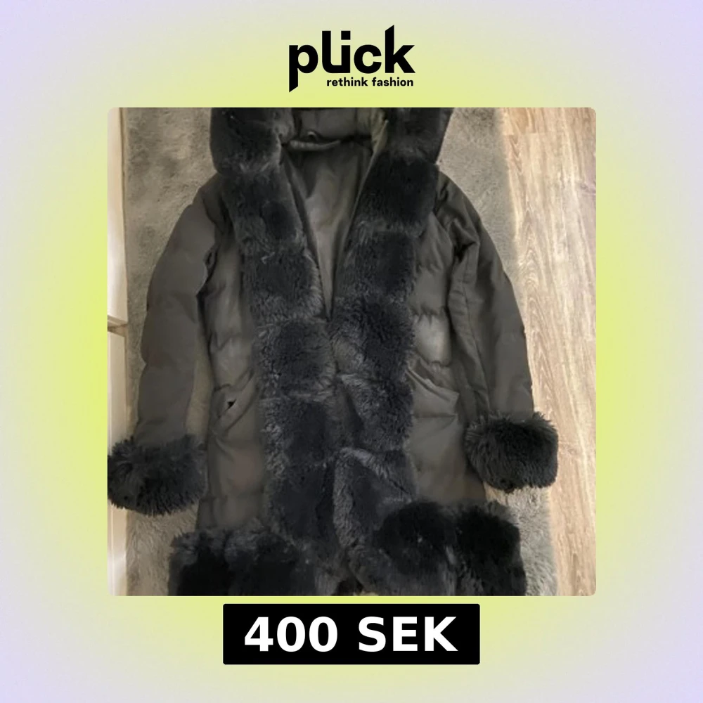 Säljer en elegant svart pälsjacka med mjukt foder och fluffiga detaljer på krage och ärmslut. Jackan har en lång design och är perfekt för kyliga dagar. Den har en stilren look och är både varm och bekväm.