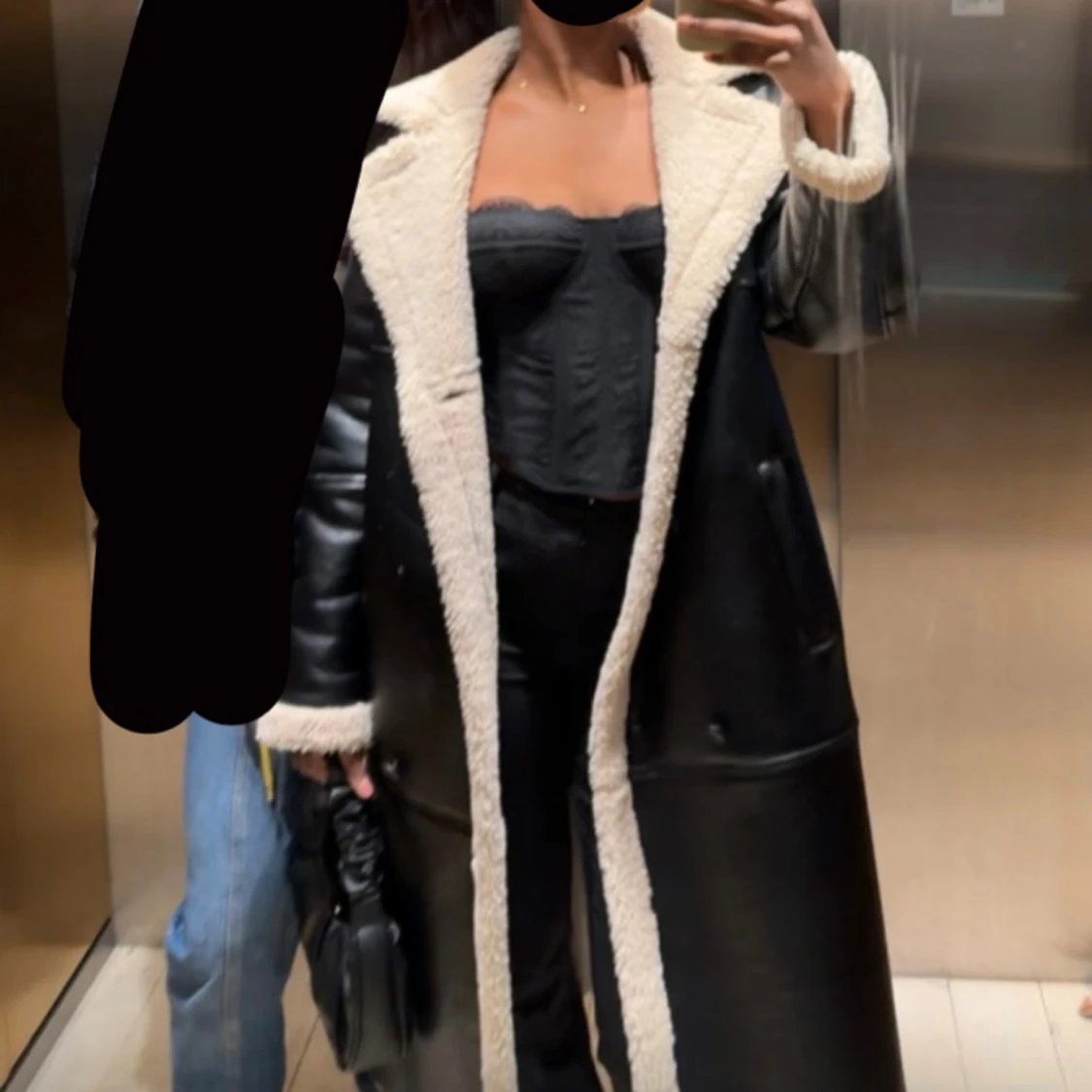 Säljer en lång svart läderjacka med vitt teddyfoder längs krage, ärmslut och hela insidan. Jackan har en oversized passform och är tillverkad i skinn, fluffigt innerfoder. Perfekt för kalla dagar och ger en riktigt trendig look.