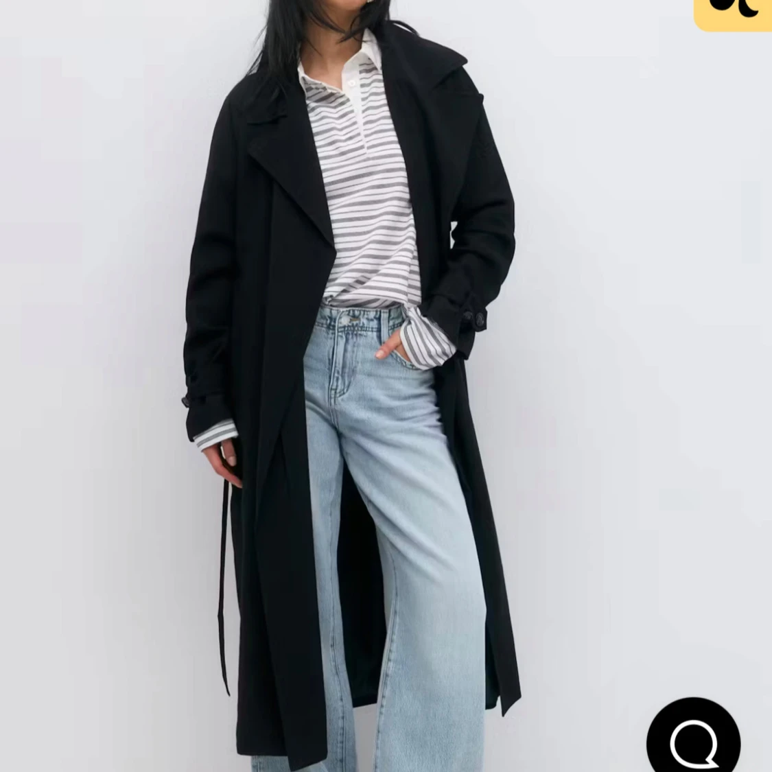 Svart trenchcoat från Gina med klassisk krage, knytskärp i midjan och knappar vid ärmslut. Lång och loose passform, perfekt för lager-på-lager. Snygg att styla med jeans och sneakers för en chill look. Helt oanvänd
