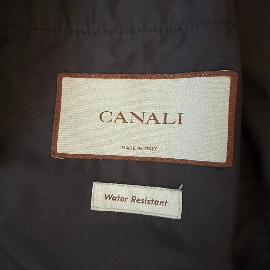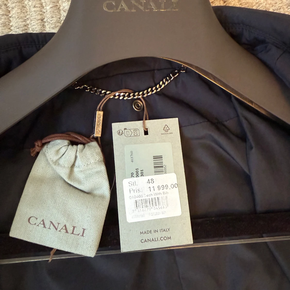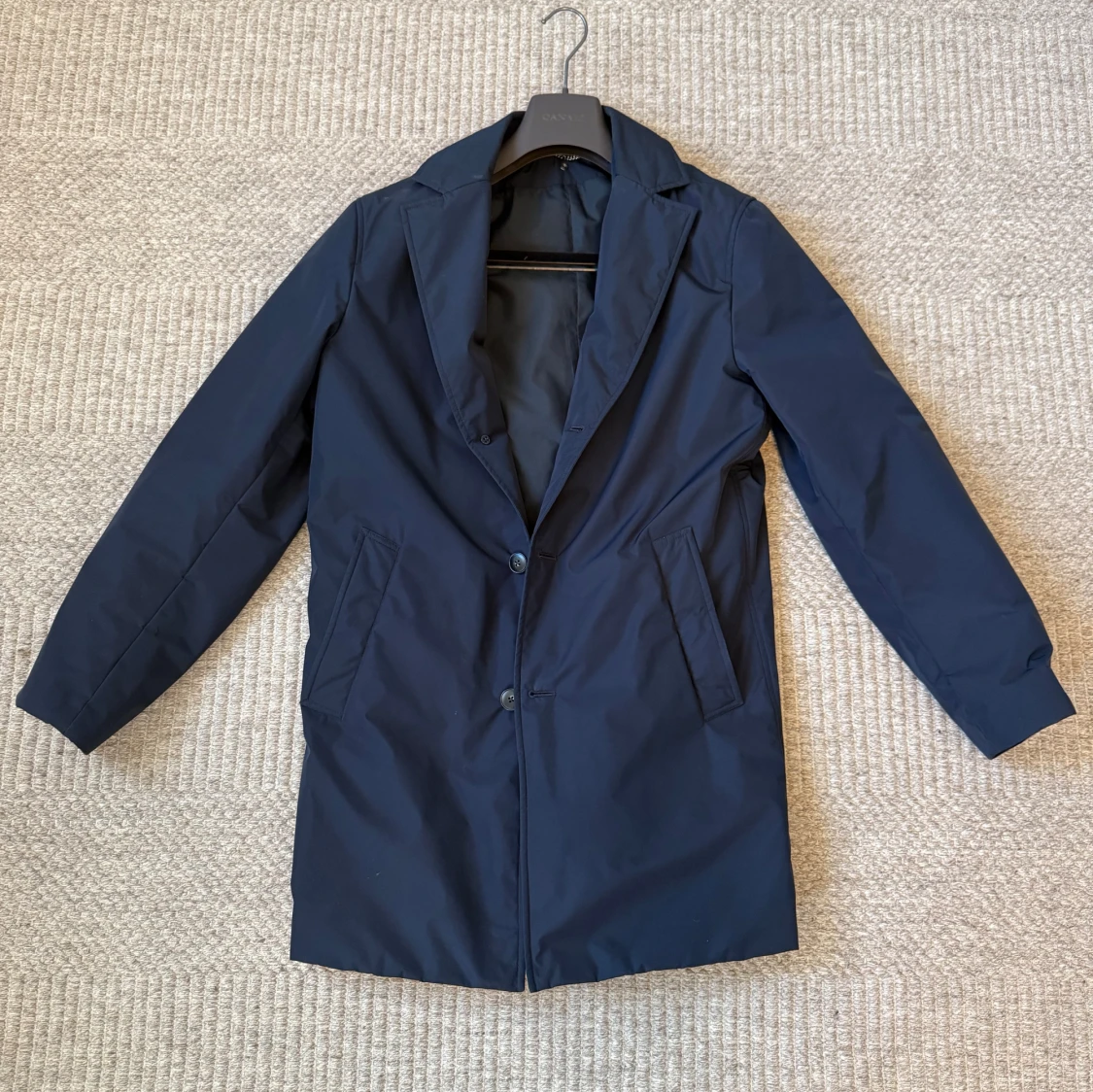 Snygg mörkblå rock från italienska Canali, tillverkad i vattenavvisande material. Klassisk design med krage, två knappar framtill och praktiska sidfickor. Perfekt för dig som vill ha en stilren och exklusiv look under höst oh vinter. Köpt på NK för 12 000kr. Passar storlek M-L