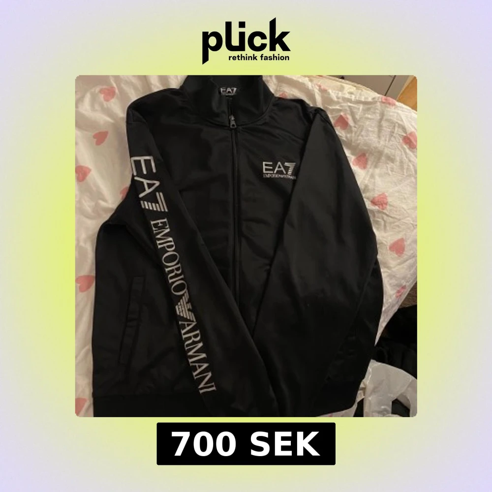 Säljer en stilren svart jacka från Emporio Armani med EA7-logga på bröstet och ärmen. Jackan har en dragkedja framtill och är långärmad. Perfekt för en sportig look eller en avslappnad dag ute.