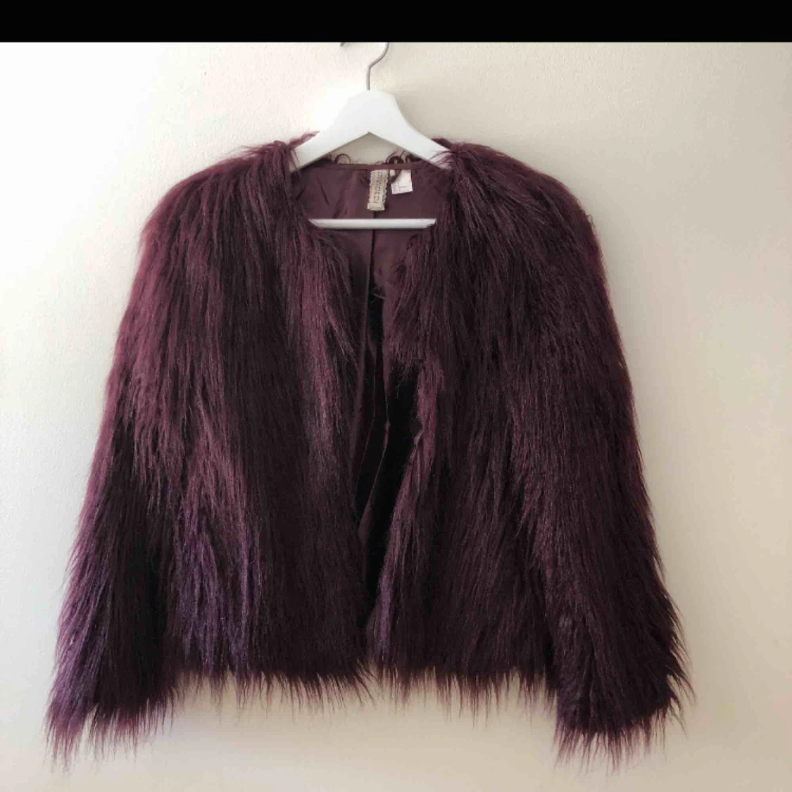 65kr frakt, varm mysig pälsjacka, inte äkta päls, fin höstig vinröd färg