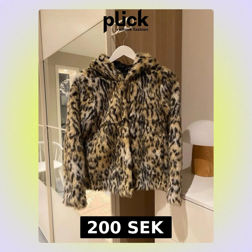 pälsjacka med leopardmönster. Jackan har huva och långa ärmar, perfekt för dig som vill sticka ut och hålla dig varm. Färgerna går i beige, svart och brun och materialet är mjuk syntetpäls. Storlek 36.