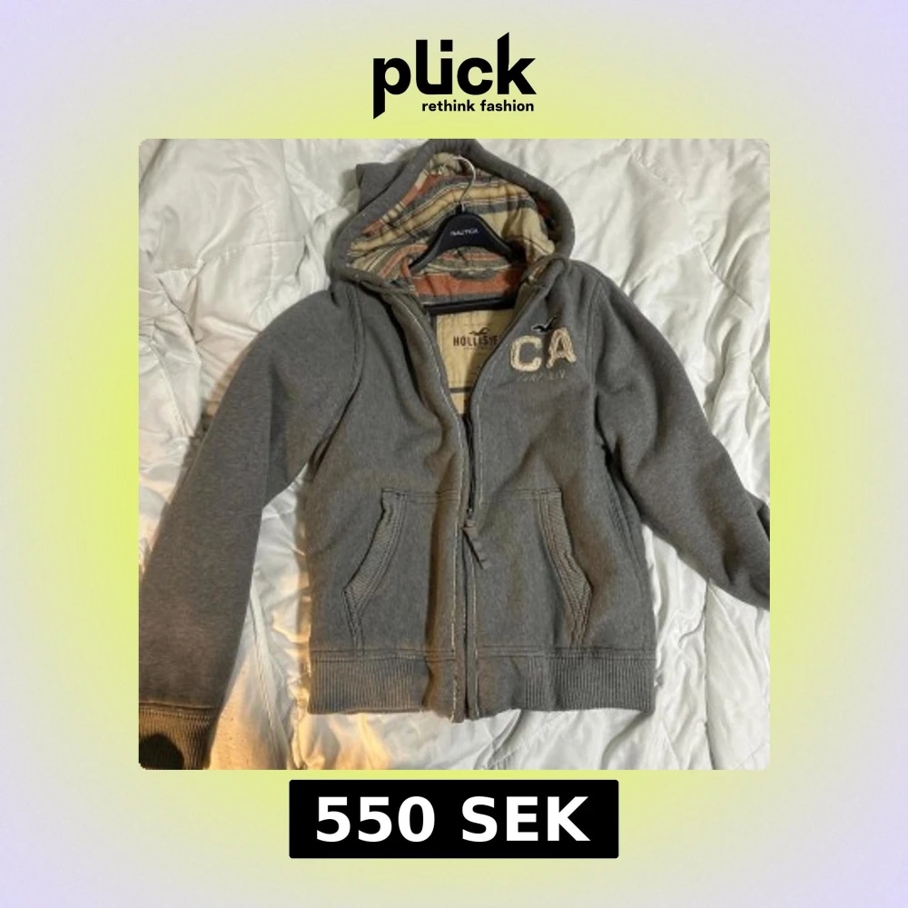 Säljer en grå hoodiejacka från Hollister med dragkedja och broderad CA-logga på bröstet. Jackan har ribbade muddar, två fickor fram och en huva med rutigt foder i beige och orange toner. Perfekt för chill dagar och streetwear.