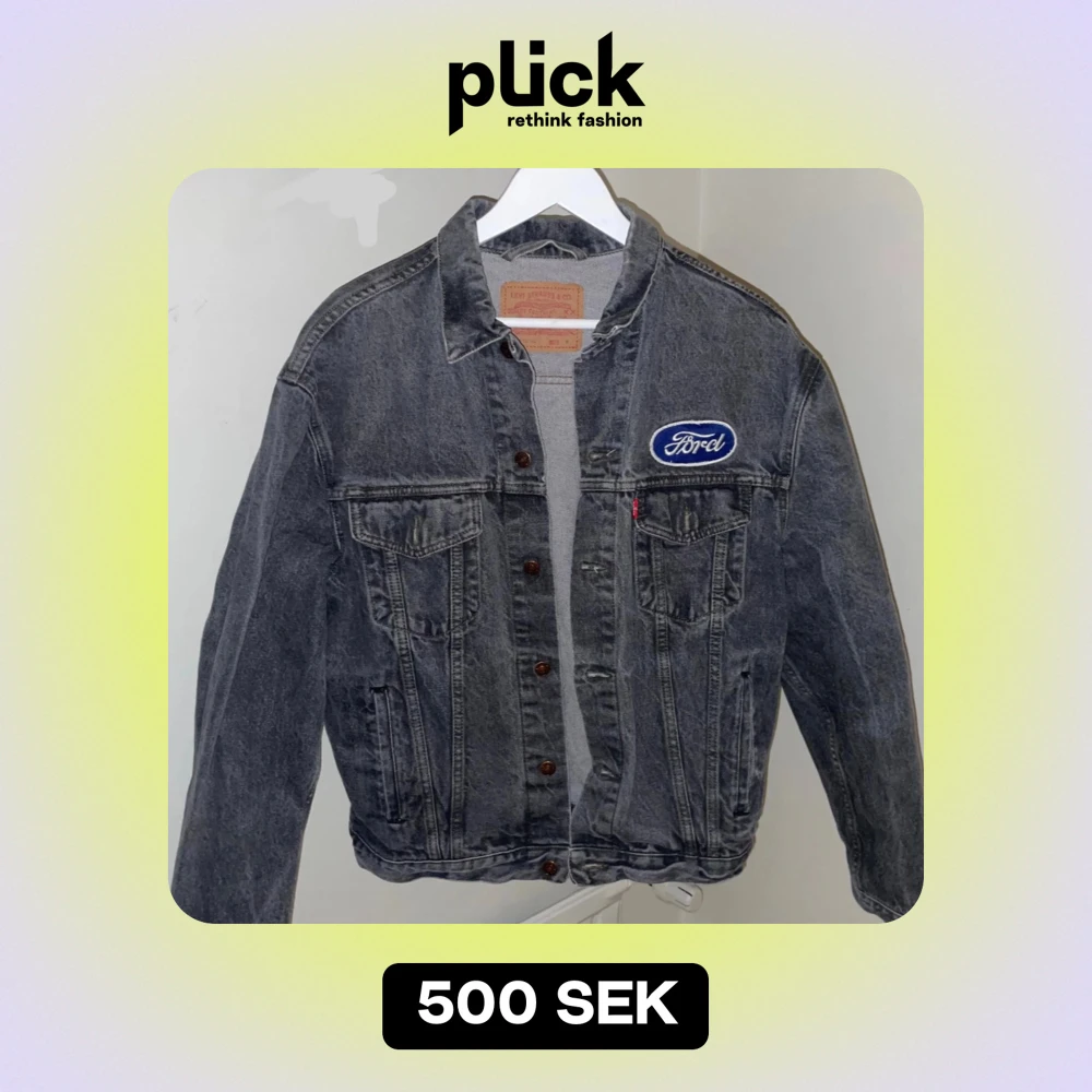 Säljer en grå jeansjacka från Levi's i bra skick. Den har ett coolt Ford-märke på bröstet och klassiska bruna knappar. Perfekt för höst och vår, med en avslappnad passform. Jackan är långärmad och har två bröstfickor med lock. Perfekt för dig som gillar en retro look!