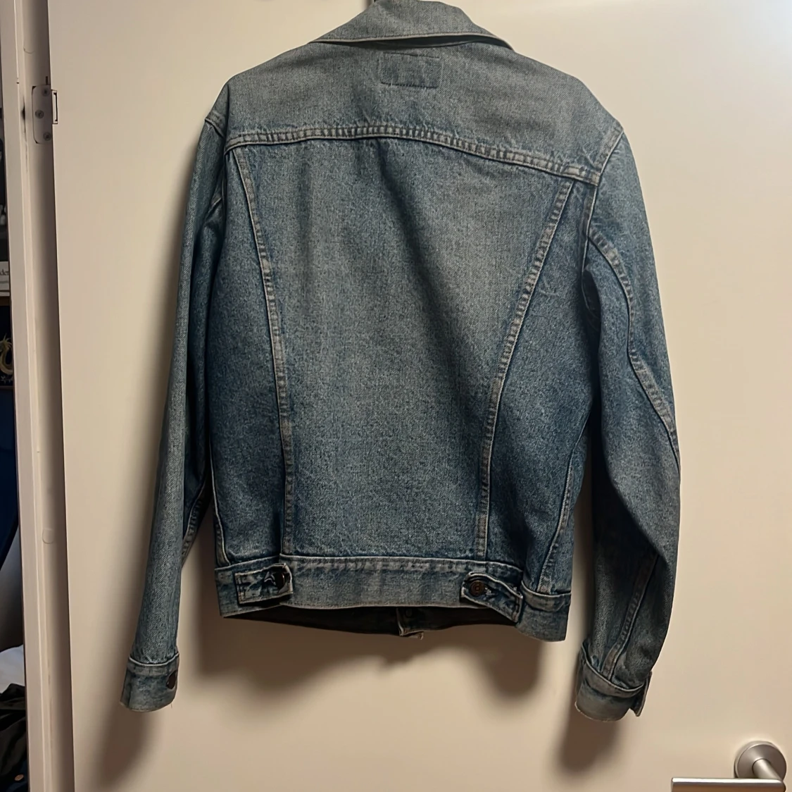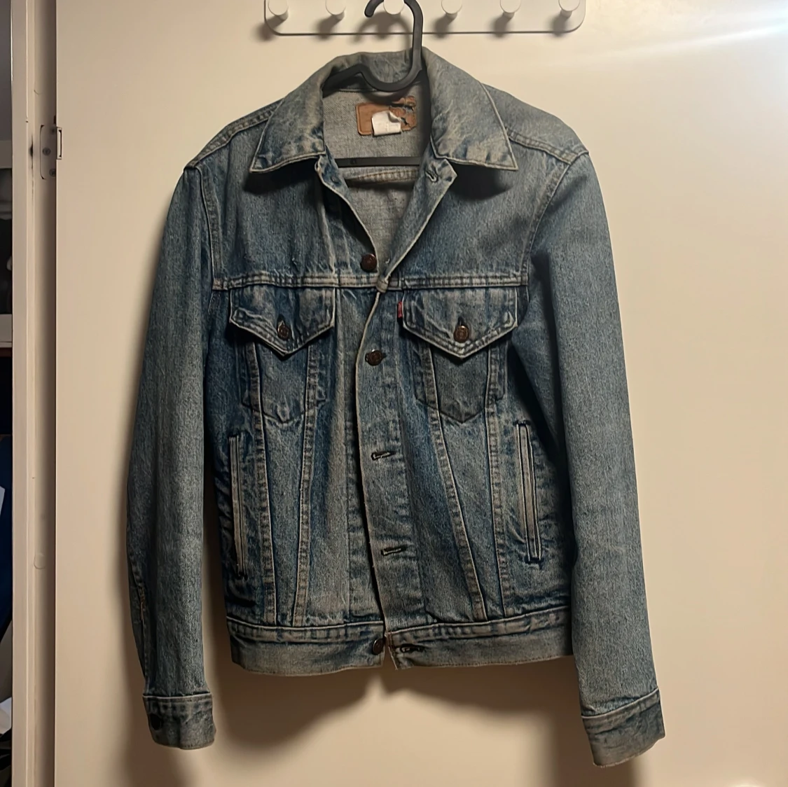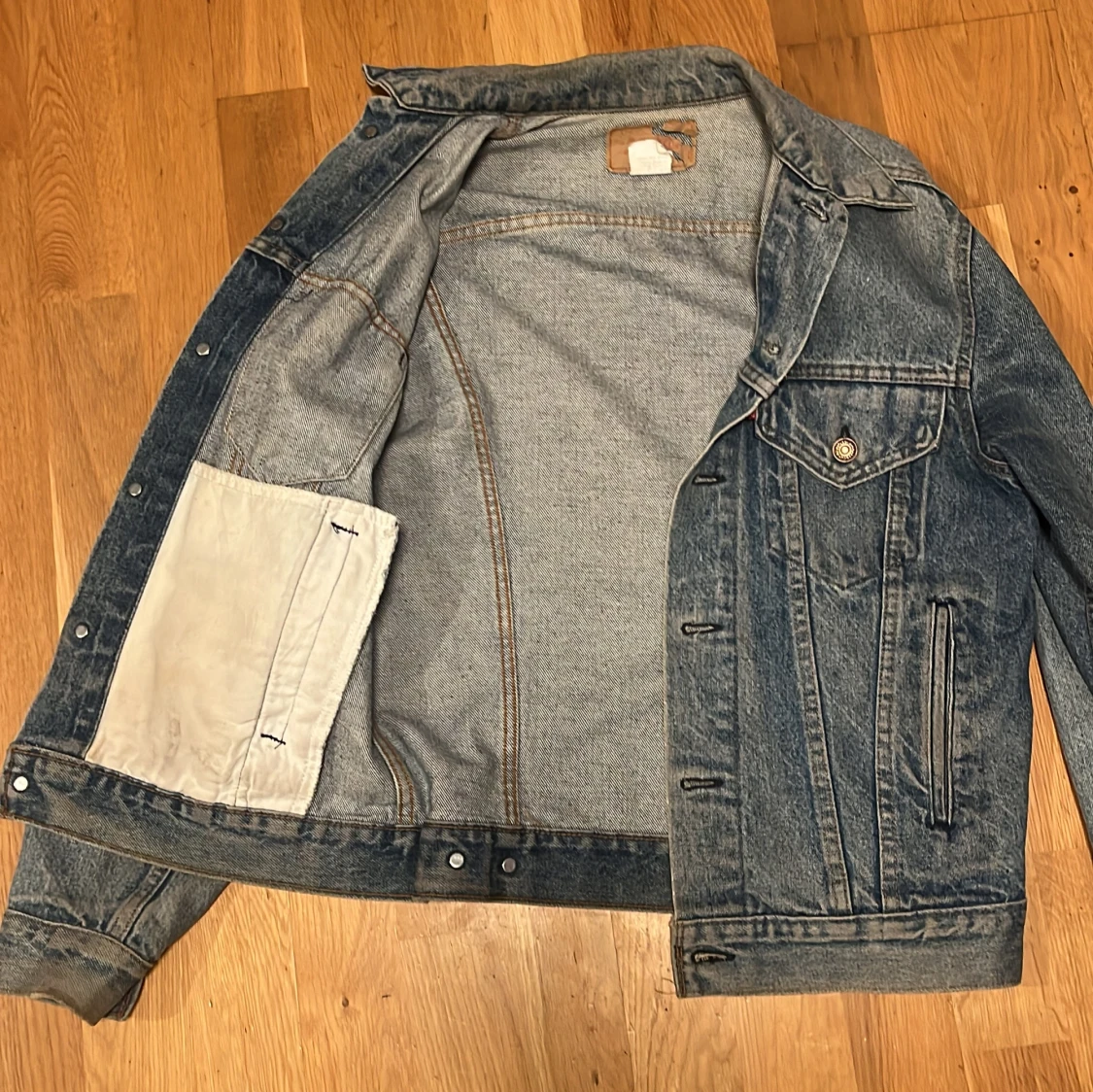 Säljer en klassisk blå jeansjacka från Levi's med snygga bruna knappar och två bröstfickor med lock. Jackan har lång ärm, krage och justerbara detaljer vid midjan. Perfekt för dig som gillar tidlös streetstil och vill ha en jacka som funkar året runt.