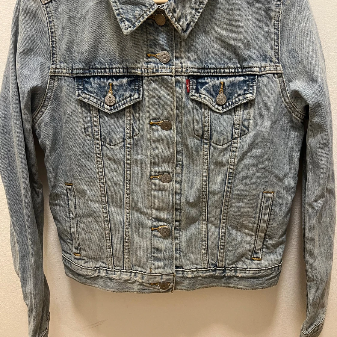 Säljer en klassisk ljusblå jeansjacka från Levi's med snygga bröstfickor och knappar framtill. Jackan har en tidlös design med krage och raka sömmar, perfekt för dig som gillar streetstyle och denim. Ikonisk röd Levi's-tagg på bröstfickan. Aldrig använd