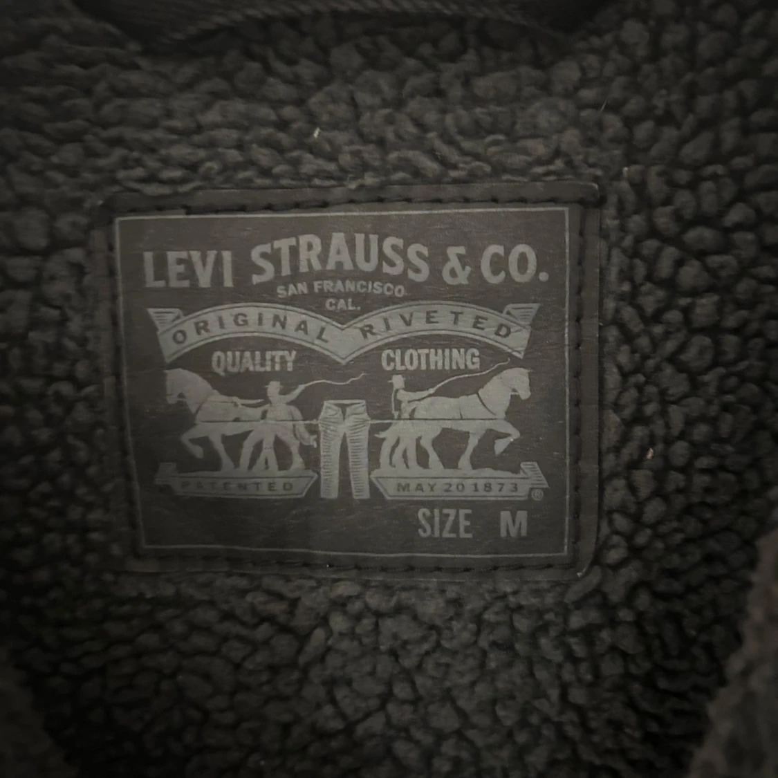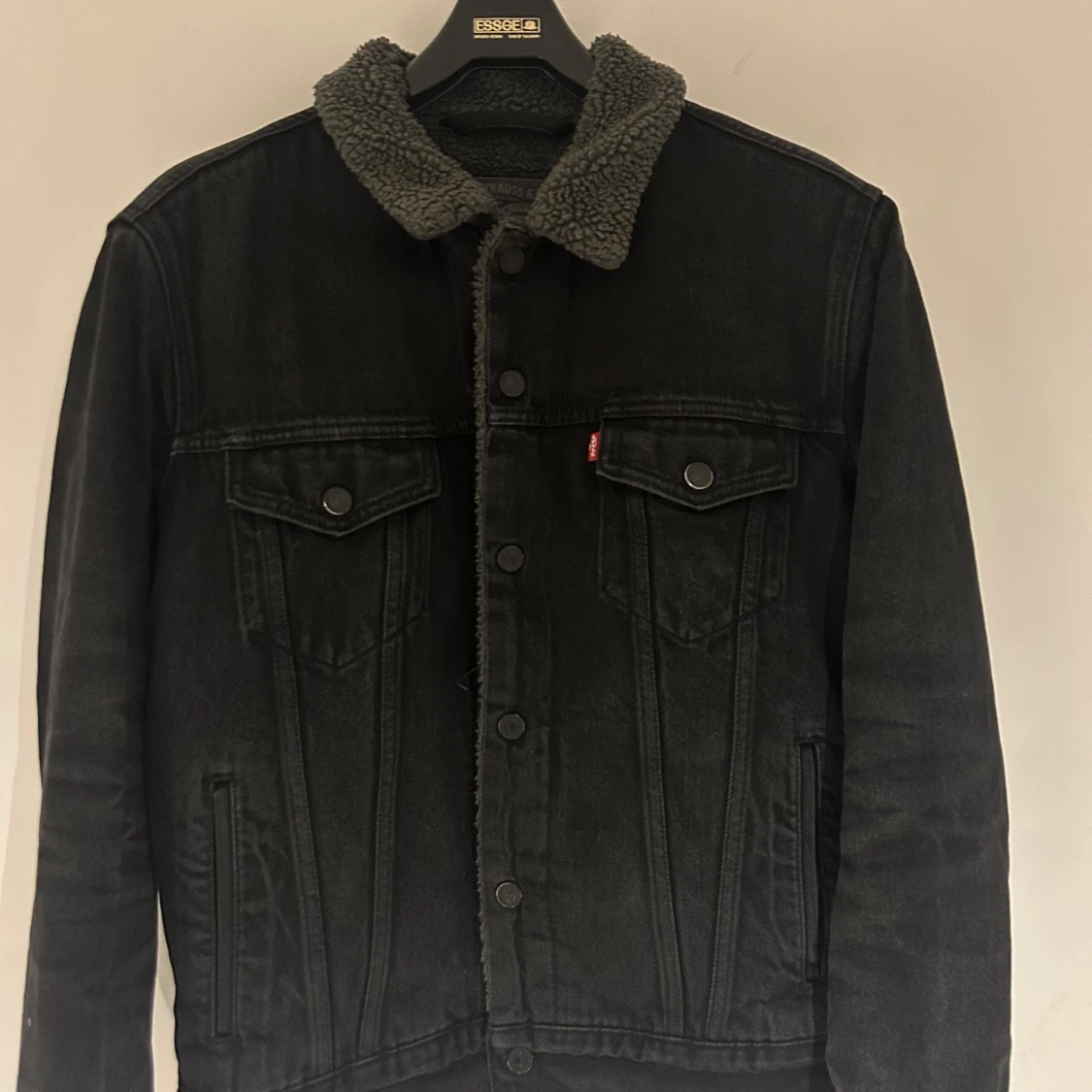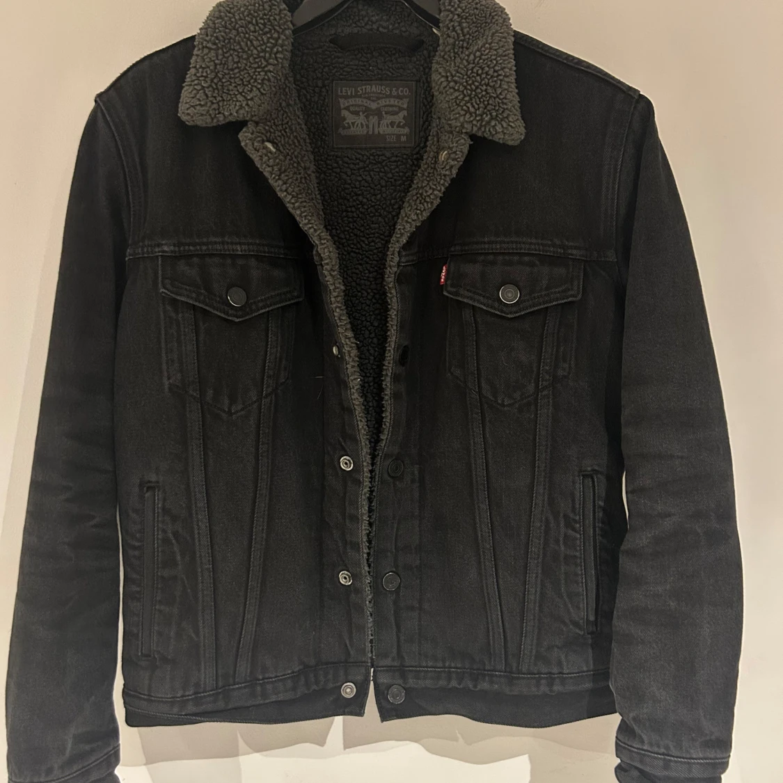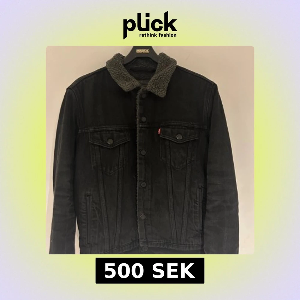 Svart jeansjacka från Levi's med mjukt teddyfoder i storlek M. Måste tyvärr sälja jackan för att den inte passar längre. Nypris 1200 kr.