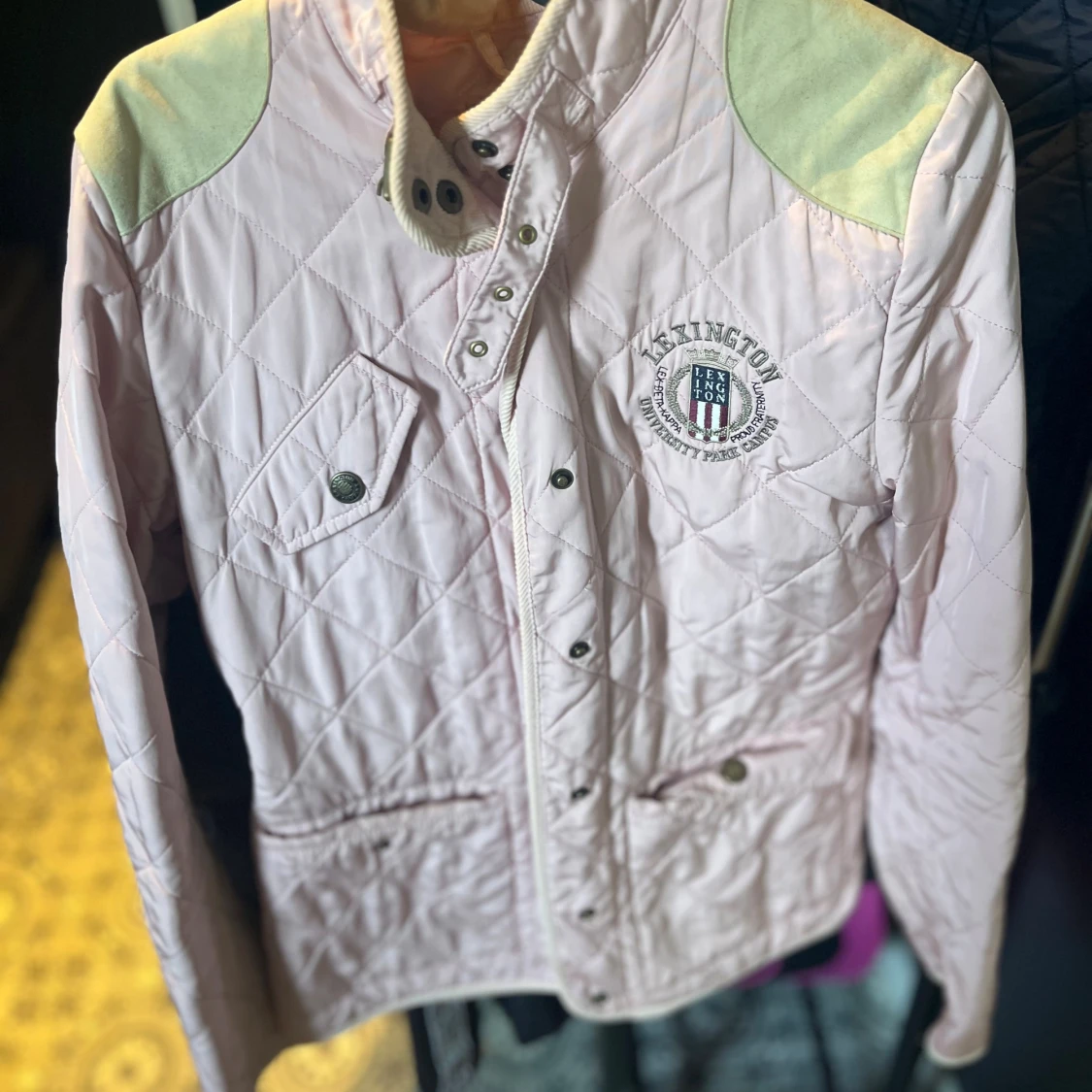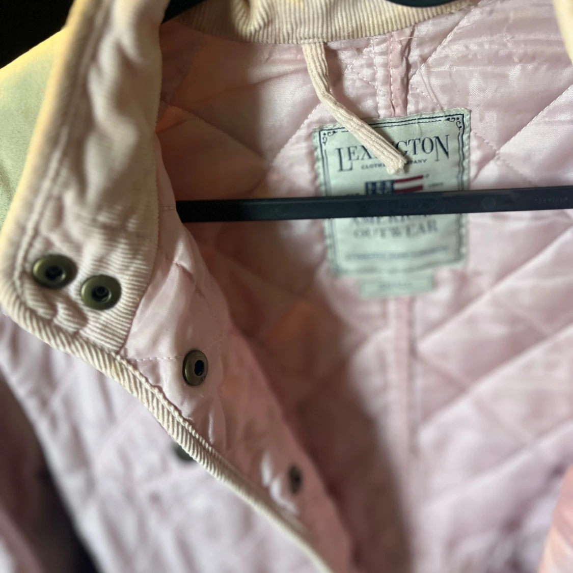 Quiltad ljusrosa jacka från Lexington med broderad logga på bröstet, ljusbeiga axelpartier och detaljerade knappar. Jackan har hög krage, tryckknappar och fickor framtill. Perfekt för dig som gillar klassisk och sportig stil.