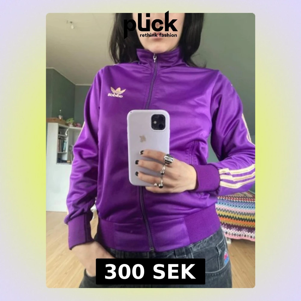 Säljer en lila Adidas vindjacka i storlek S med klassiska vita och gula stripes längs ärmarna. Jackan har dragkedja framtill, ribbade muddar och ståkrage. Adidas-logga på bröstet och backsidan, och fickor med dragkedja. Perfekt för en sportig och chill look.