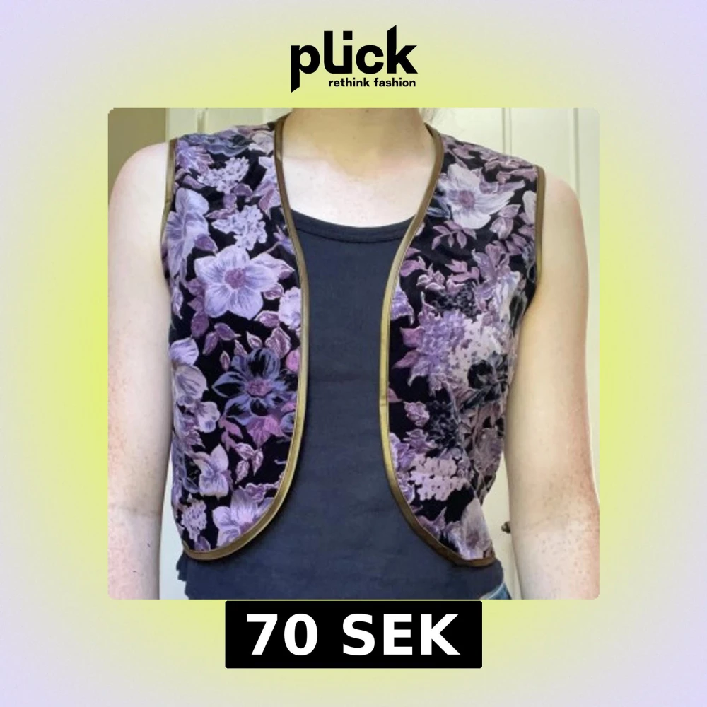 Snygg väst med blommigt mönster i lila och svart, kantad med guld. Västen är ärmlös och har en öppen front med rundad nederkant.