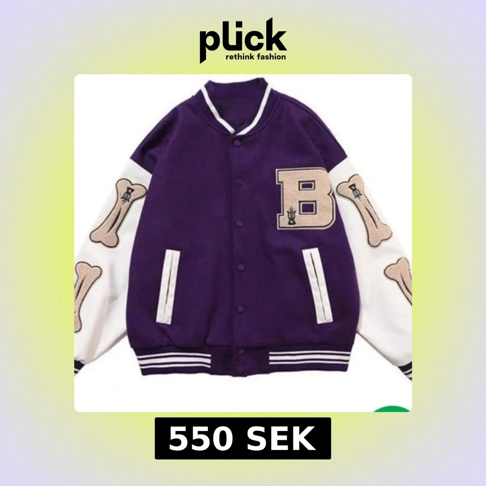 Snygg lila bomberjacka med vita ärmar och benmotiv. Jackan har en stor bokstav 'B' på bröstet och ribbade muddar i vitt och lila. Perfekt för en cool och avslappnad stil. Skadad: Har en liten röd fläck på höger arm. Storlek: L/XL. Välanvänd dock nt använd sen 2021, köpt på plick.