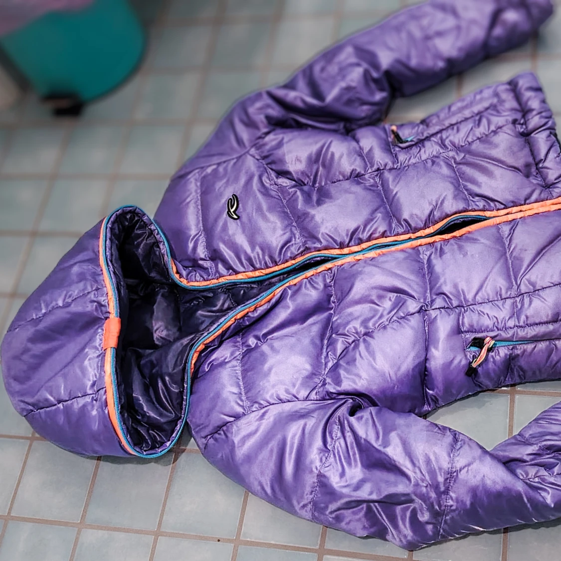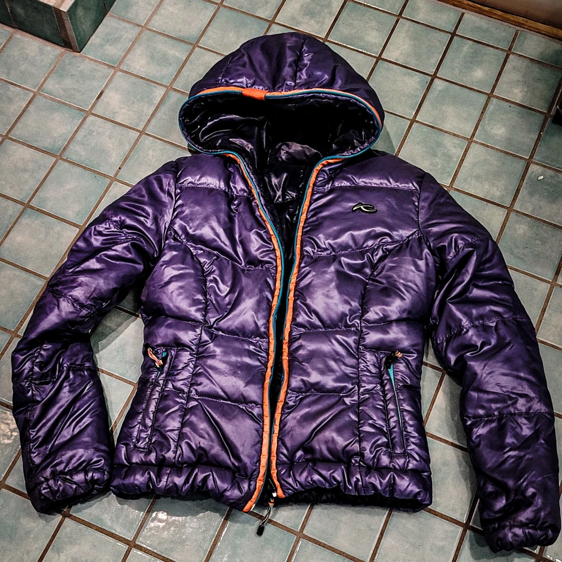 Säljer en lila dunjacka med huva och coola färgdetaljer i orange och blå vid dragkedjan. Jackan har quiltad design, två fickor och kan vändas ut och in. Finns väldigt lite bruksslitage eller tecken på användning och det lilla som finns syns ej.