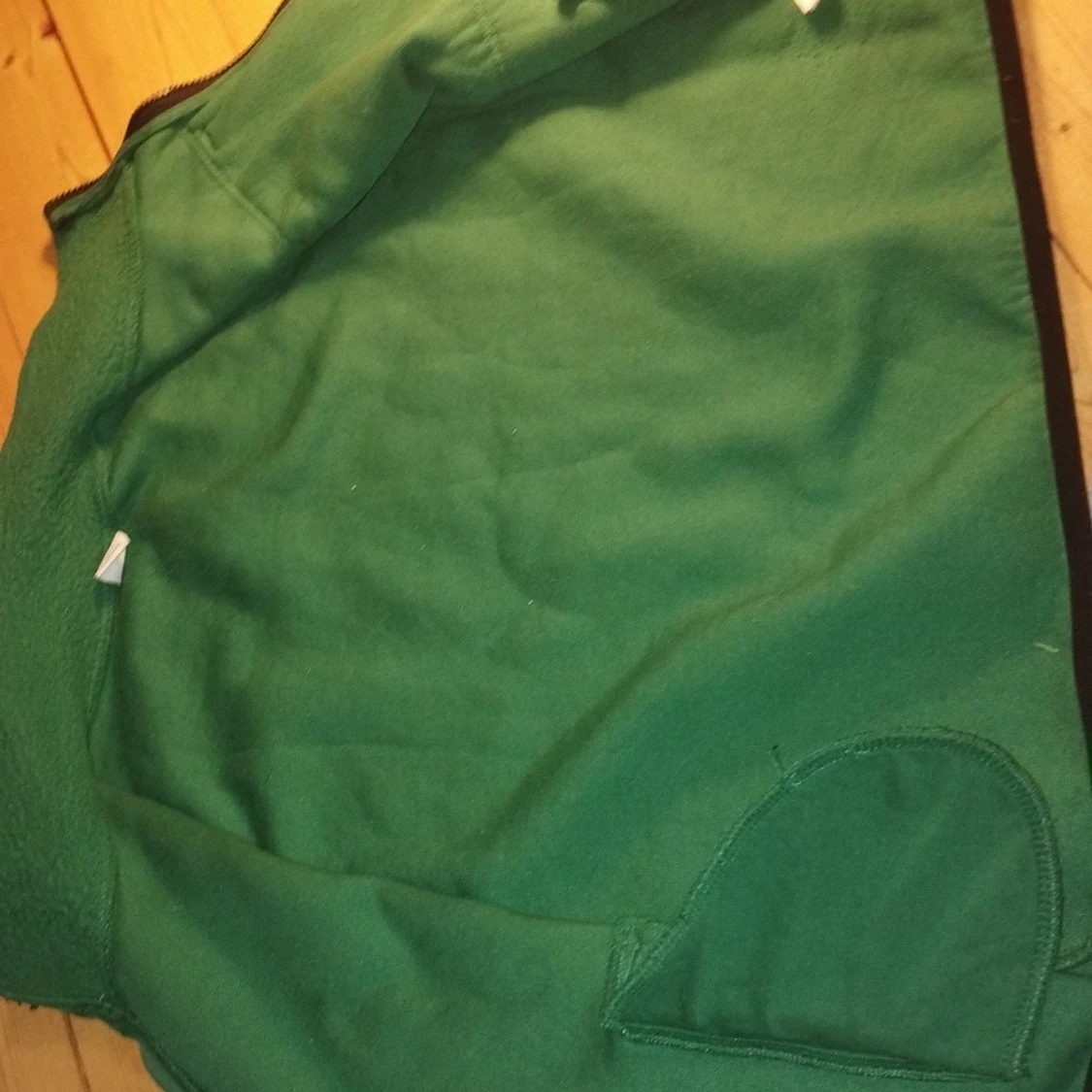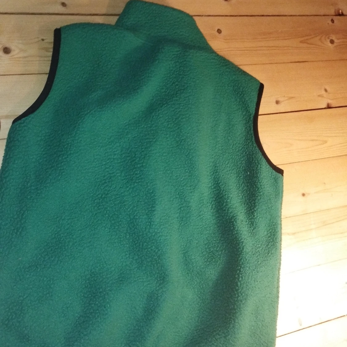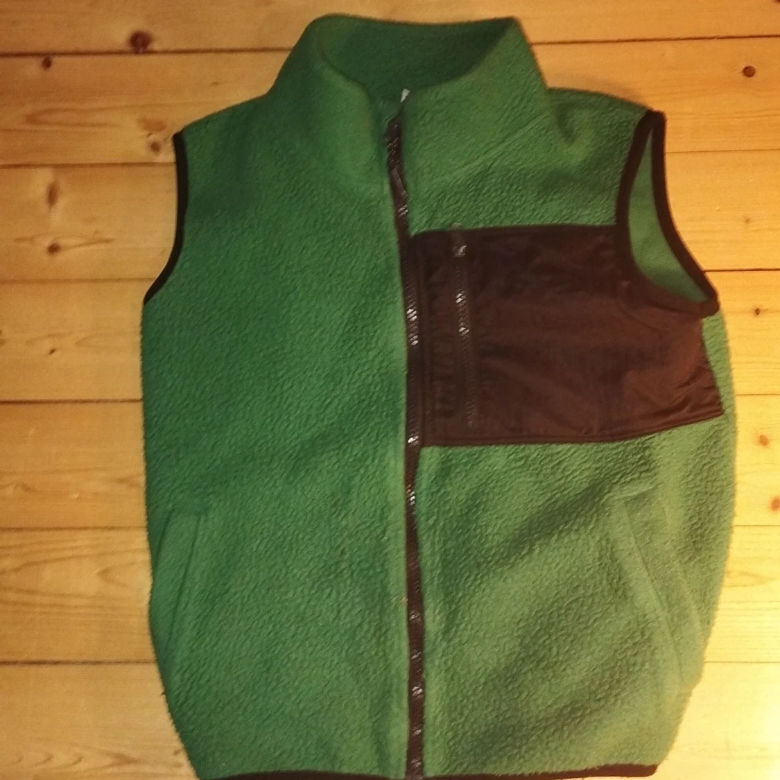 Grön fleeceväst med hög krage och svart bröstficka i nylonmaterial med dragkedja. Västen har hel dragkedja framtill och svarta kantband vid ärmöppningarna. Perfekt för lager-på-lager och chill utomhus.