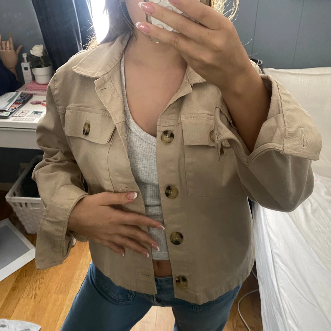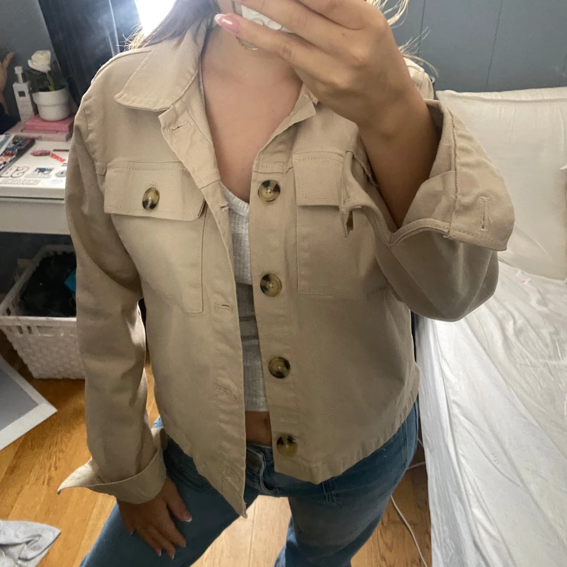 Kjempefin denim stoff jakke i beige med fine knapper! En av mine favoritt jakker, men har kjøpt en som likner så derfor selger jeg denne. Den er str 164 barnestørrelse. Xxs/xs