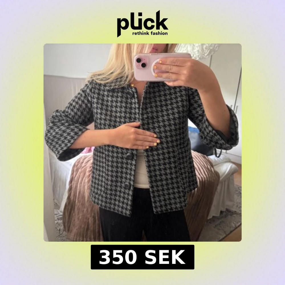 Säljer en så fin jacka/kavaj aktig från Lindex i grått och svart mönster. Jackan har trekvartsärm, stora knappar framtill och en rak passform.