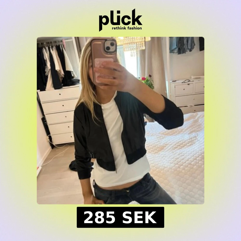 Säljer en svart croppad bolero med dragkedja framtill. Jackan har lång ärm och en klassisk bomberkrage. Perfekt för dig som vill ha en kortare bolero med modern känsla.