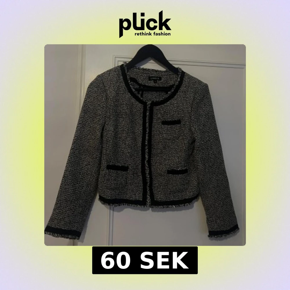 Säljer en svartvit kavaj från Lindex med rundad krage och dekorativa svarta kanter. Jackan har tre fickor framtill och fransiga detaljer längs kanterna. Perfekt för en stilren och klassisk look.