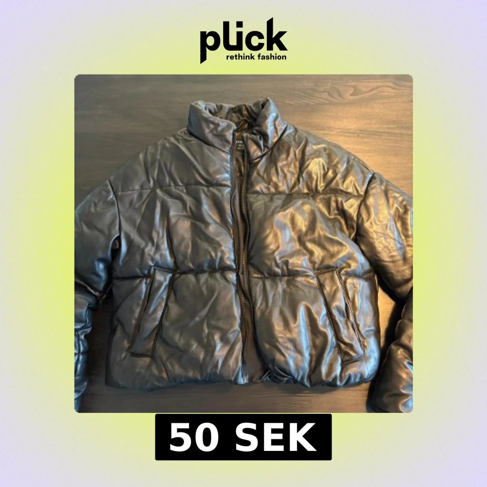 Säljer en svart pufferjacka från Lindex i storlek XS. Materialet är skinnimitation. Litet märke på ryggen se sista bilden, syns knappt.