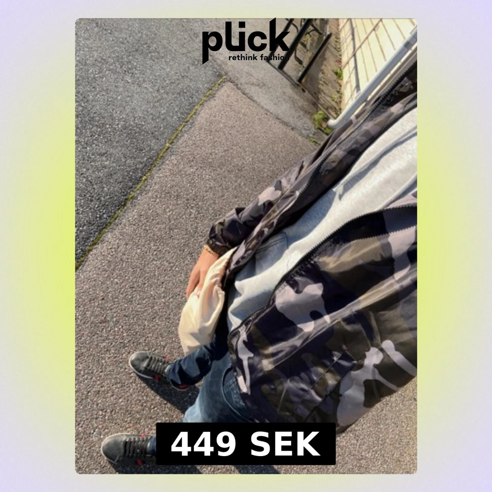 Säljer en snygg vindjacka med camouflagemönster i svart, grått och grönt. Jackan har huva, dragkedja framtill och elastiska muddar vid ärmsluten. Perfekt för dig som vill ha en streetig look och gillar att sticka ut.