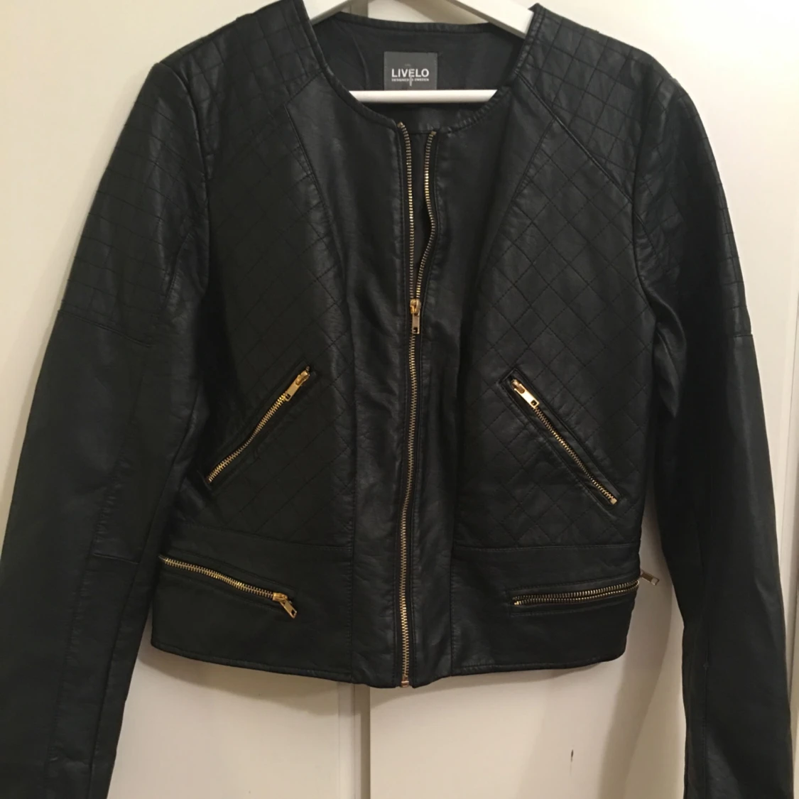 Skinnjacka i svart med gulddetaljer Nyskick. Möts i STHLM , huddinge.