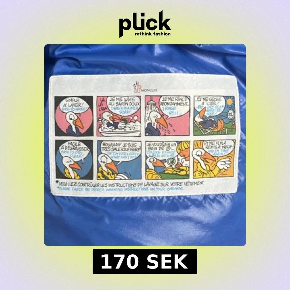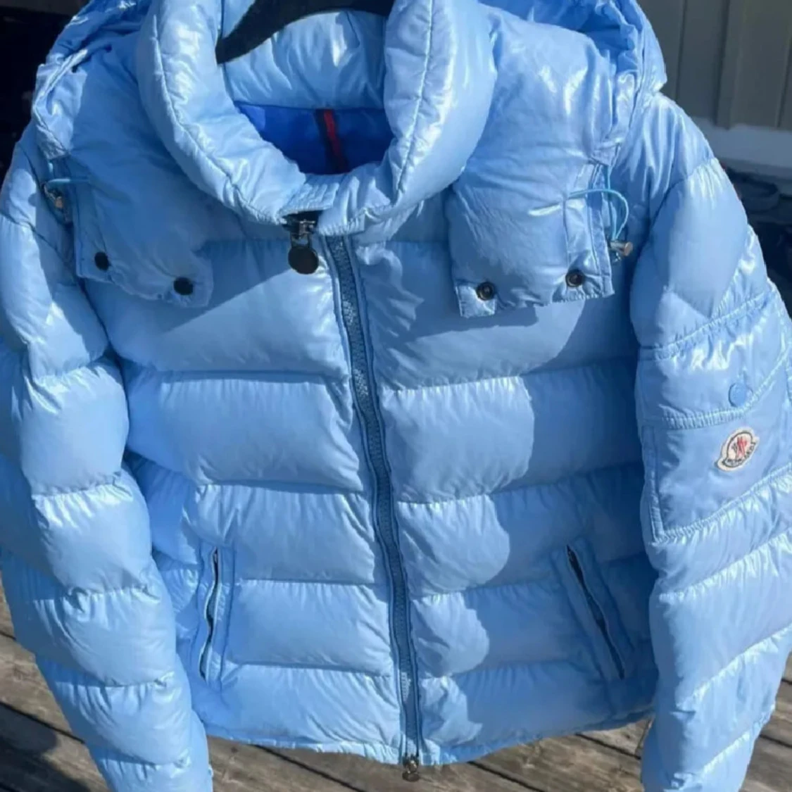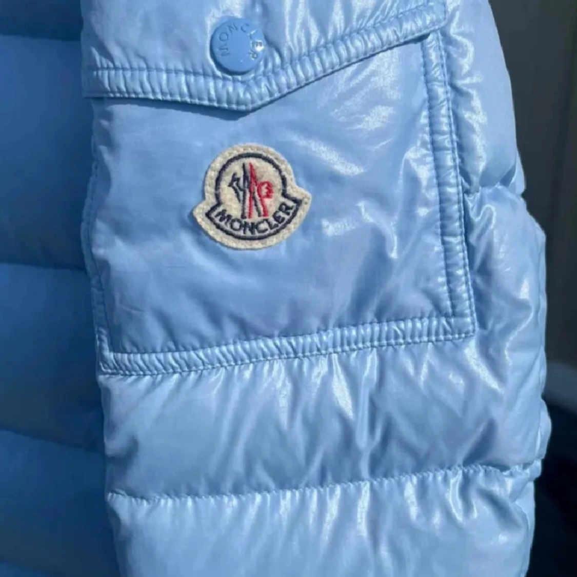 Snygg ljusblå dunjacka från Moncler med dragkedja och tryckknappar. Jackan har en hög krage och Moncler-logga på ärmen. Perfekt för kyliga dagar med sin pufferdesign.
