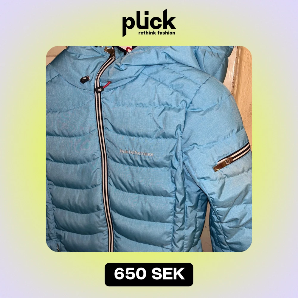 Säljer en snygg ljusblå dunjacka från Peak Performance i storlek S. Jackan har en dragkedja framtill och praktiska fickor med dragkedjor. Perfekt för kyliga dagar med sin varma och bekväma passform. Huvan ger extra skydd mot väder och vind. Nypris- mellan 4-5000kr